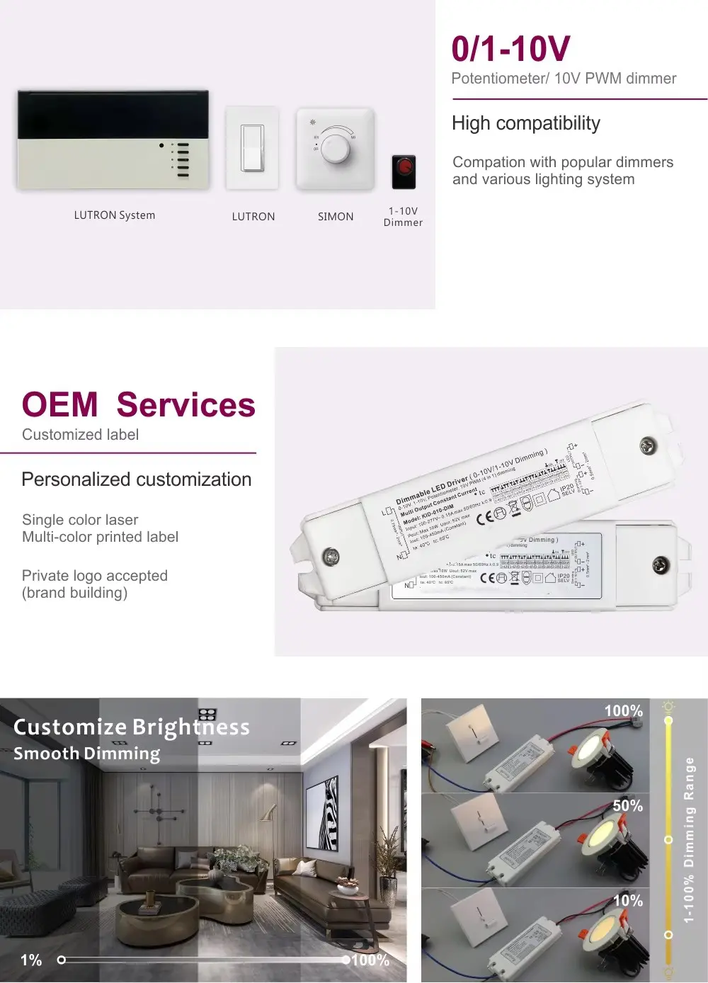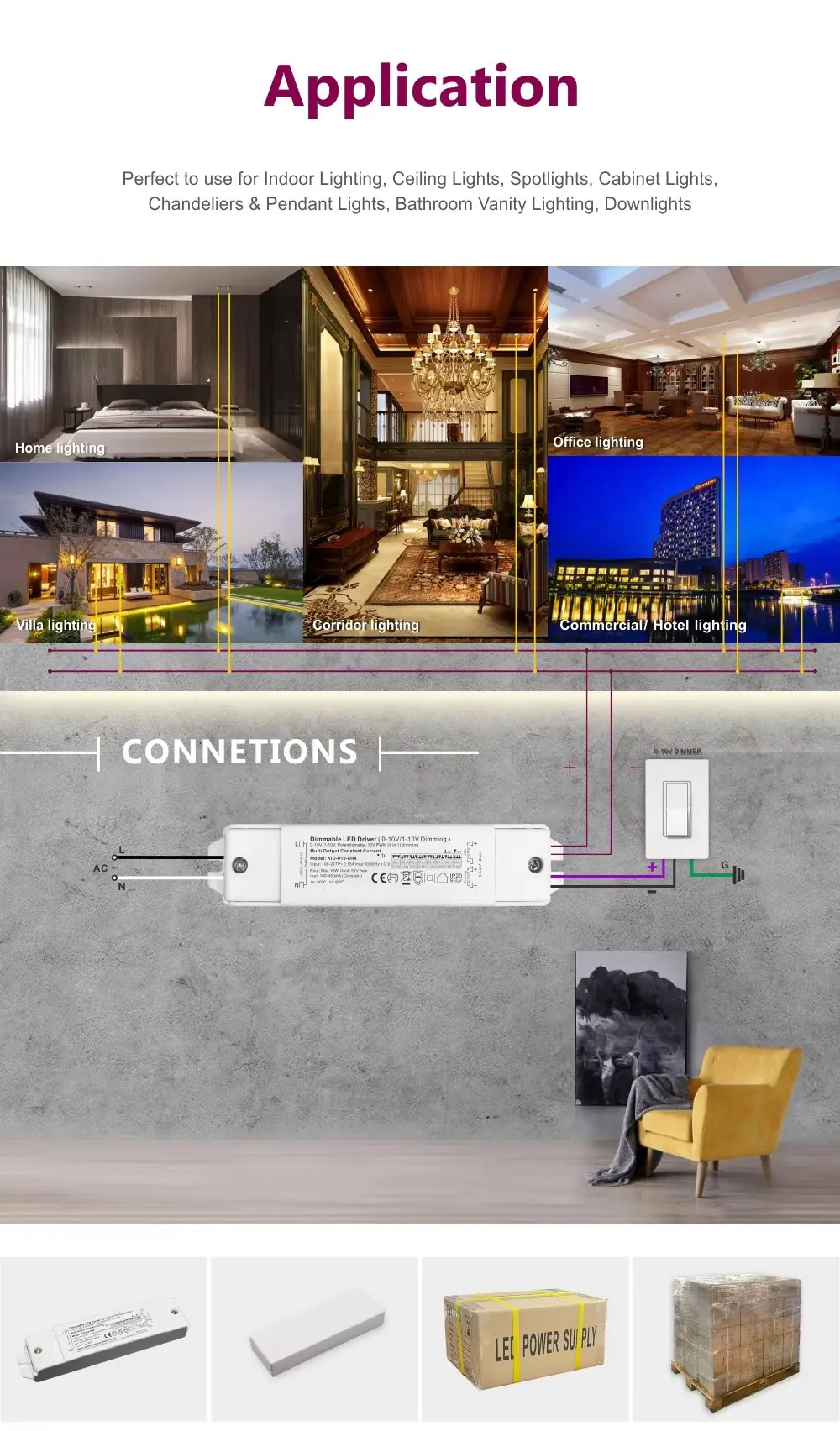 Conçu pour offrir des performances constantes, ce variateur prend en charge une large sortie 3-42 V CC, ce qui le rend compatible avec une vaste gamme de modules et de bandes LED basse tension courants. Son acceptation de tension d'entrée à large plage garantit un fonctionnement stable dans divers environnements électriques. Capable de supporter des charges de 10 W à 60 W, il est parfaitement adapté à un large éventail d'applications intérieures : de l'éclairage d'accentuation, des criques et de l'éclairage de travail sous les armoires dans les maisons, à l'éclairage ambiant plus exigeant dans les hôtels, restaurants et bureaux.