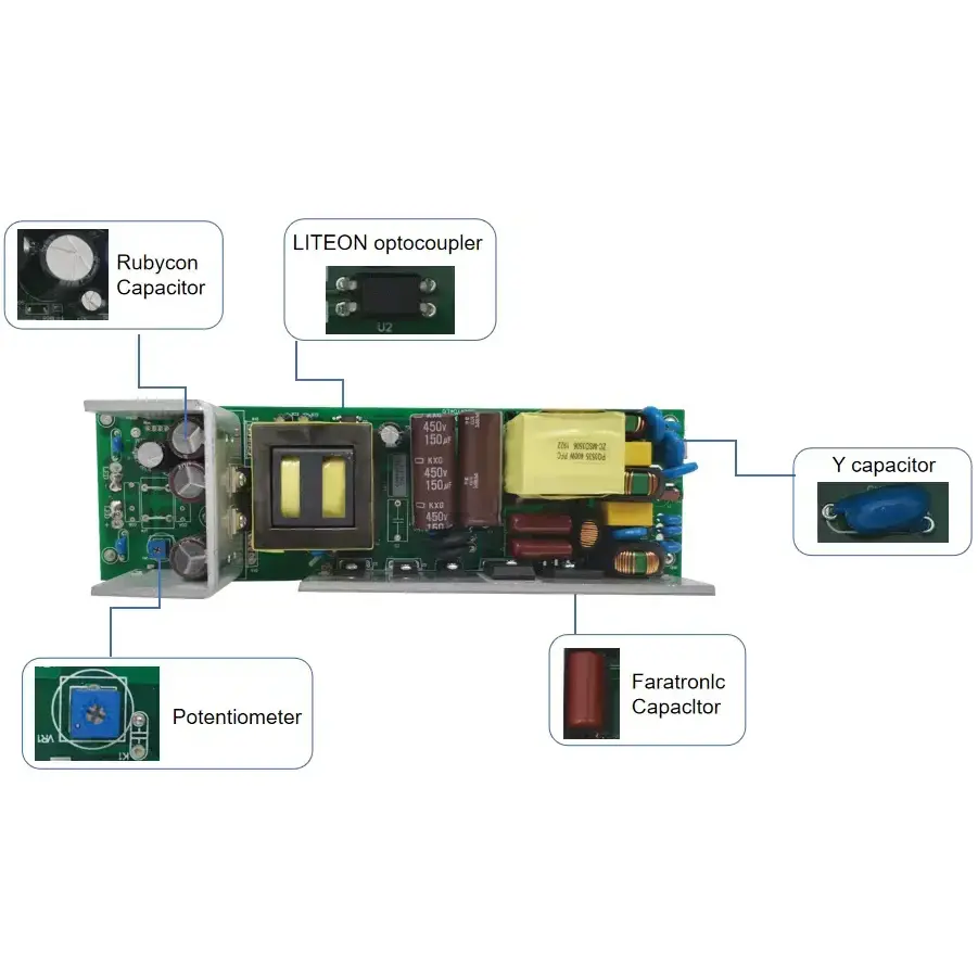 Protection quadruple · Sûr et sécurisé : surveillance en temps réel de l'état du circuit, seuil de protection contre les surtensions > 130 % de la tension d'entrée, seuil de protection contre les surintensités > 120 % du courant de sortie, température de protection contre la surchauffe > 105 ℃ et mise hors tension immédiate en 0,1 seconde en cas de court-circuit, évitant ainsi les dommages matériels et les risques de sécurité électrique.