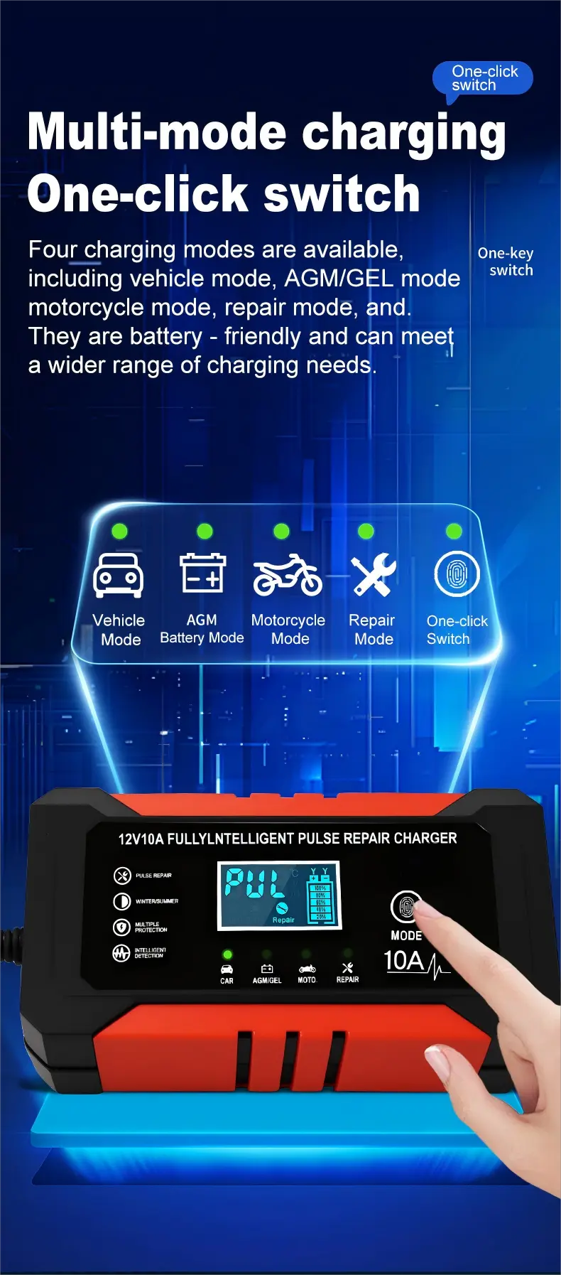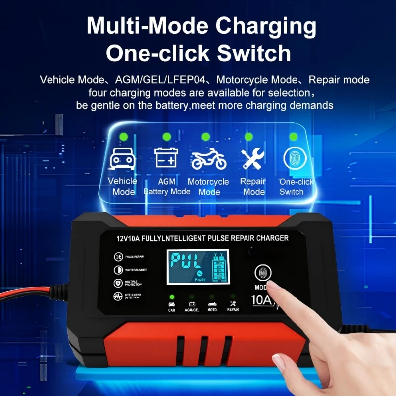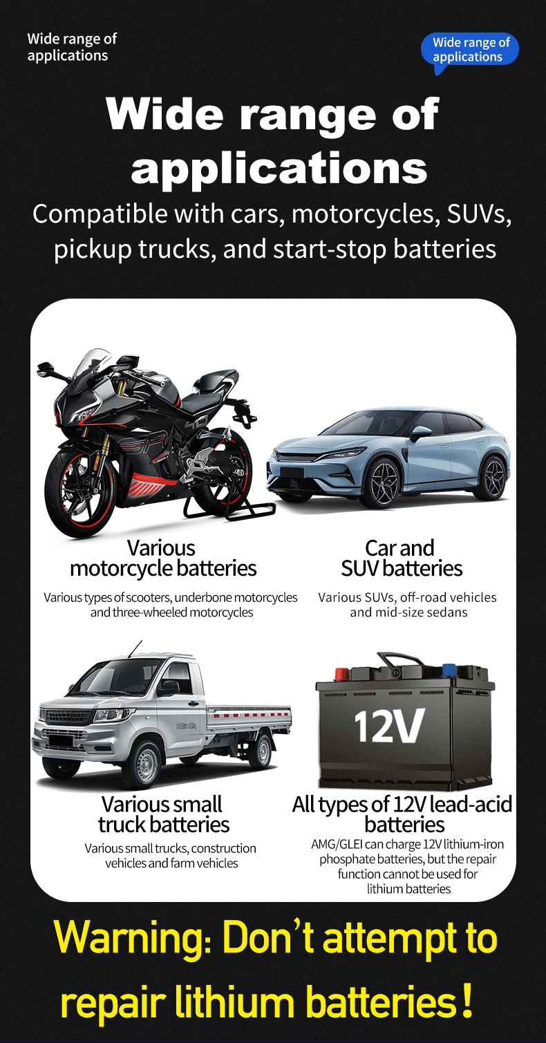 1. Compatibilité universelle et prise en charge de plusieurs batteries : il fonctionne de manière transparente avec tous les types de batteries 12 V, y compris le plomb-acide, l'AGM, le Gel et la LiFePO4, couvrant des capacités de batterie de 6 Ah à 180 Ah. La large plage d'entrée de 110 ~ 230 V élimine les limitations régionales, ce qui la rend utilisable dans plus de 100 pays et régions du monde.