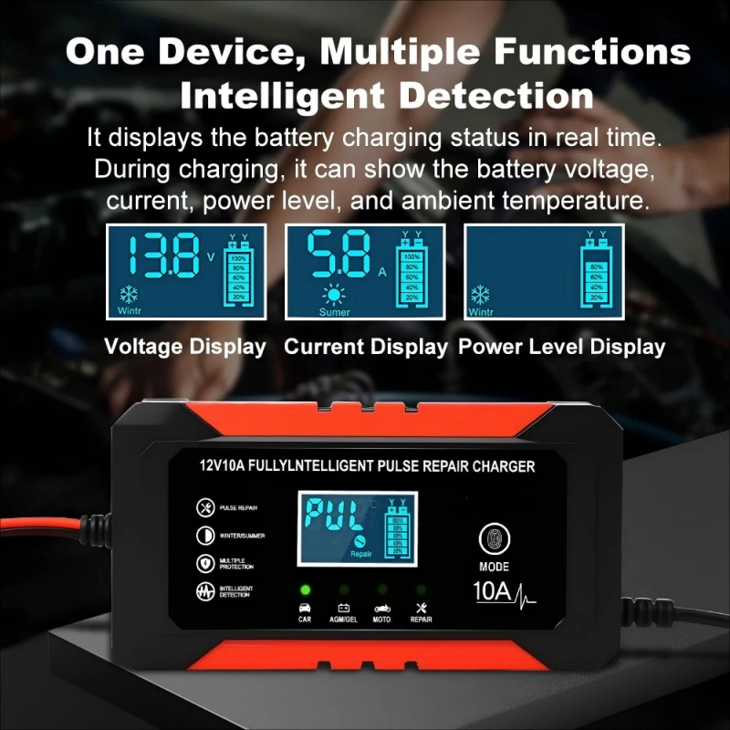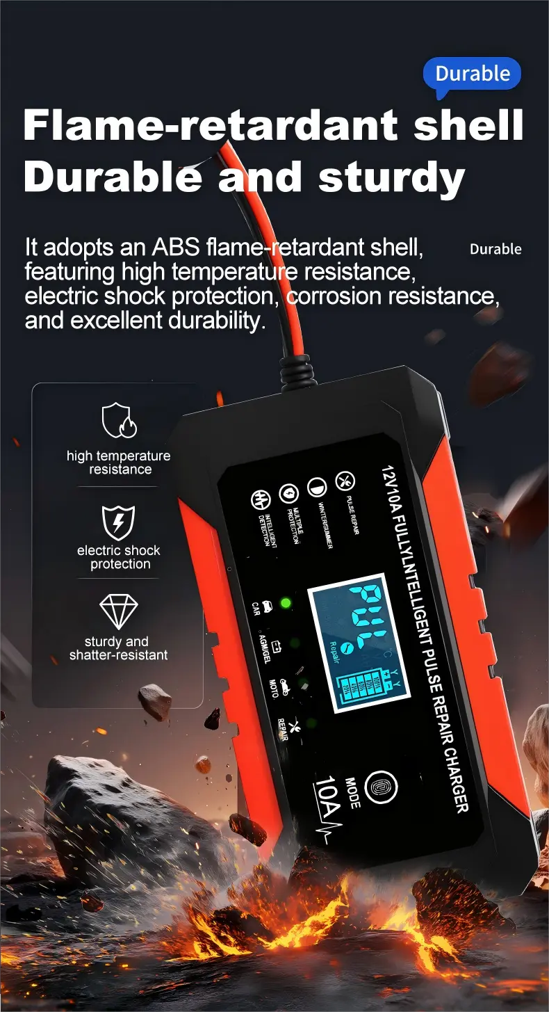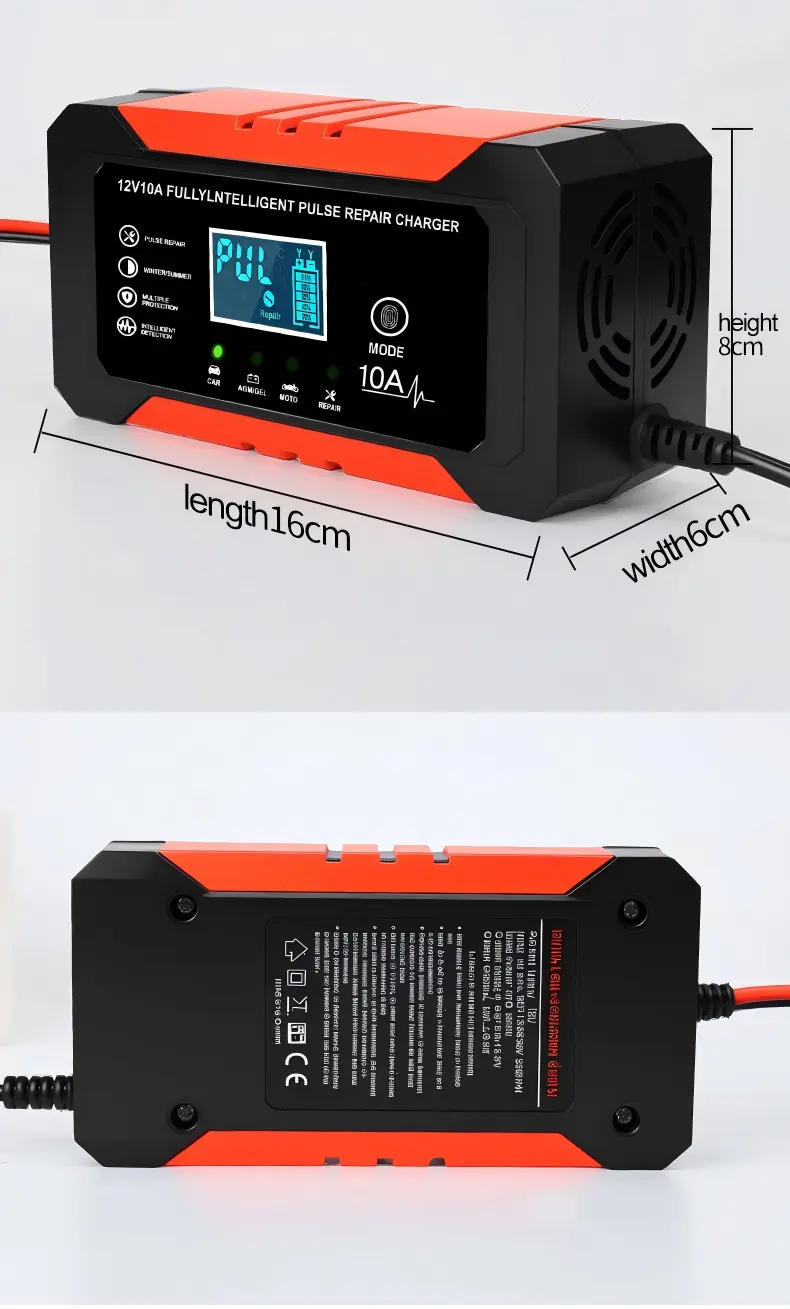 Doté de spécifications techniques précises, ce chargeur de batterie intelligent dispose d'une plage de tension d'entrée universelle de 110 ~ 230 V AC (50/60 Hz), garantissant la compatibilité avec les réseaux électriques du monde entier. Il fournit une sortie stable de 12 V CC avec un courant de charge de 10 A, fournissant une puissance constante pour recharger rapidement les batteries, capable de charger complètement une batterie au plomb de 100 Ah en 10 heures environ, ce qui est nettement plus rapide que les chargeurs standard de 5 A. Avec une efficacité énergétique de plus de 95 %, il minimise le gaspillage d'énergie, tandis que son boîtier compact en aluminium (170 × 90 × 50 mm, 1,0 kg) assure portabilité et durabilité.
