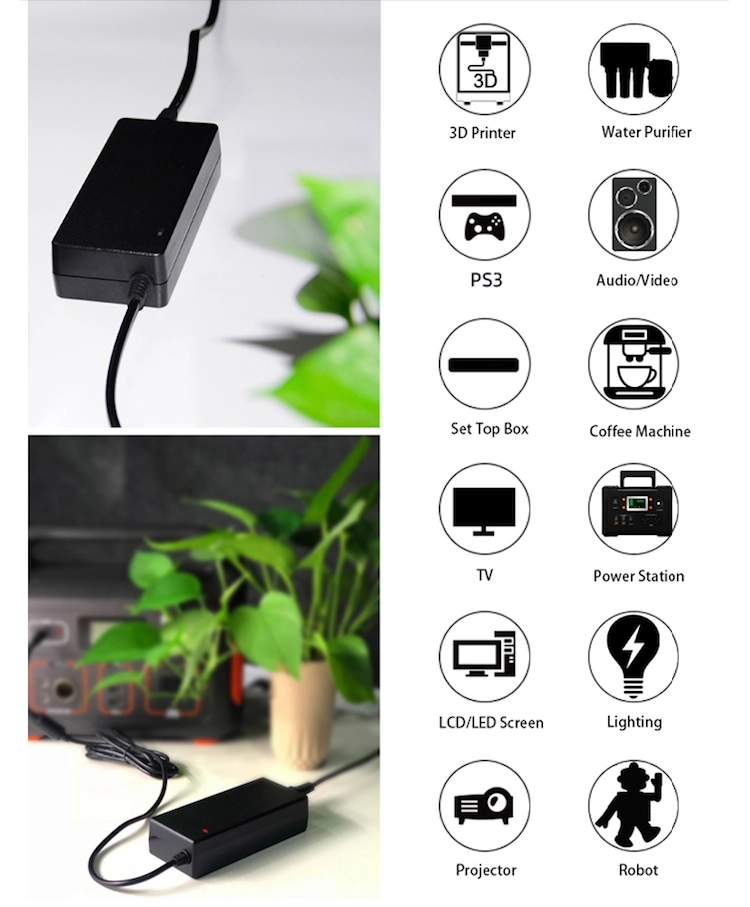 * Plus d'unités pour la série 120 W : 12 V/15 V/20 V/24 V/36 V/48 V disponibles * Sécurité : OCP/OVP/OTP, SCP, coupure automatique de surcharge, coupure de surtension, coupure thermique automatique. * Compatibilités étendues: bandes lumineuses LED, imprimante 3D, émetteur-récepteur radioamateur, caméras de vidéosurveillance, amplificateur de caisson de basses de voiture, amplificateur audio, routeur sans fil, chats ADSL, humidificateur, HUB, clavier, haut-parleur BT, moniteur, webcam, DVR, NVR, alimentation audio/vidéo