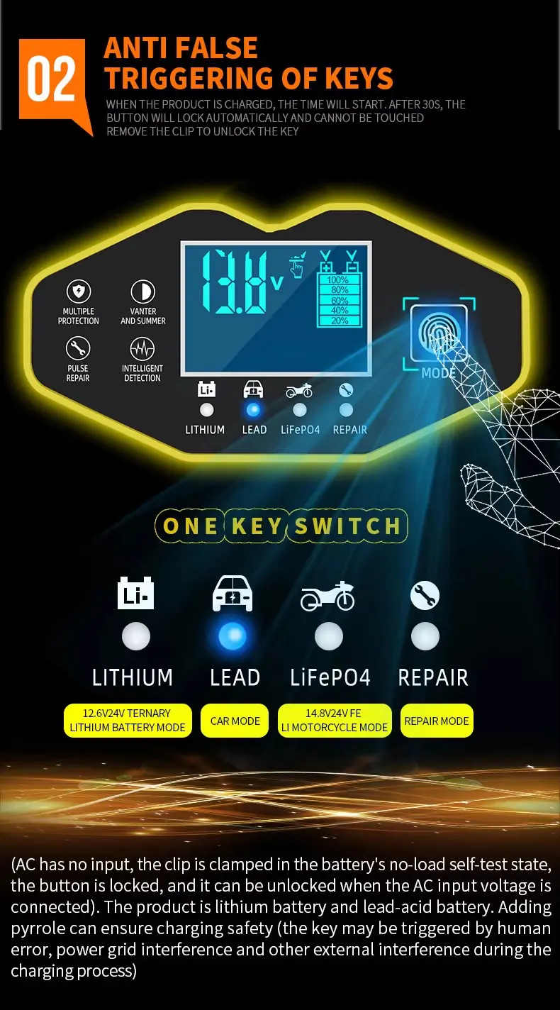1. Intelligent et compatible Le ZYX-J40 prend en charge presque tous les types de batteries du marché, y compris les batteries au plomb, AGM, Gel, EFB, Li-ion et LiFePO₄ (phosphate de fer lithium). Avec une large plage de capacités de 2 Ah à 150 Ah, il gère tout, des petites batteries de moto aux grosses batteries de voiture.