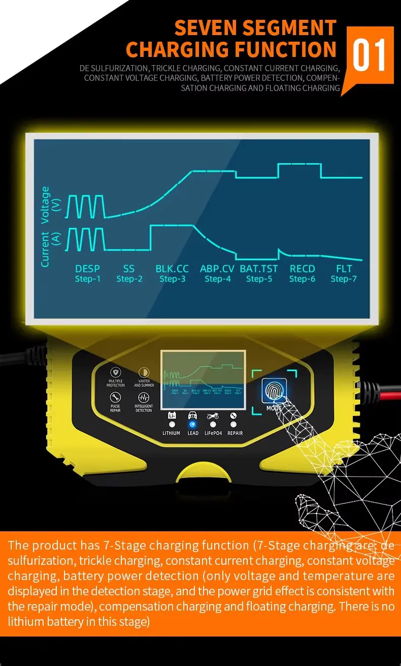 Les chargeurs à 7 étapes conviennent à la plupart des types de batteries, notamment au calcium, au gel AGM, à l'eau et au lithium. Acide de plomb. Piles LifePo4. Ils peuvent également aider à restaurer les batteries épuisées et sulfatées.