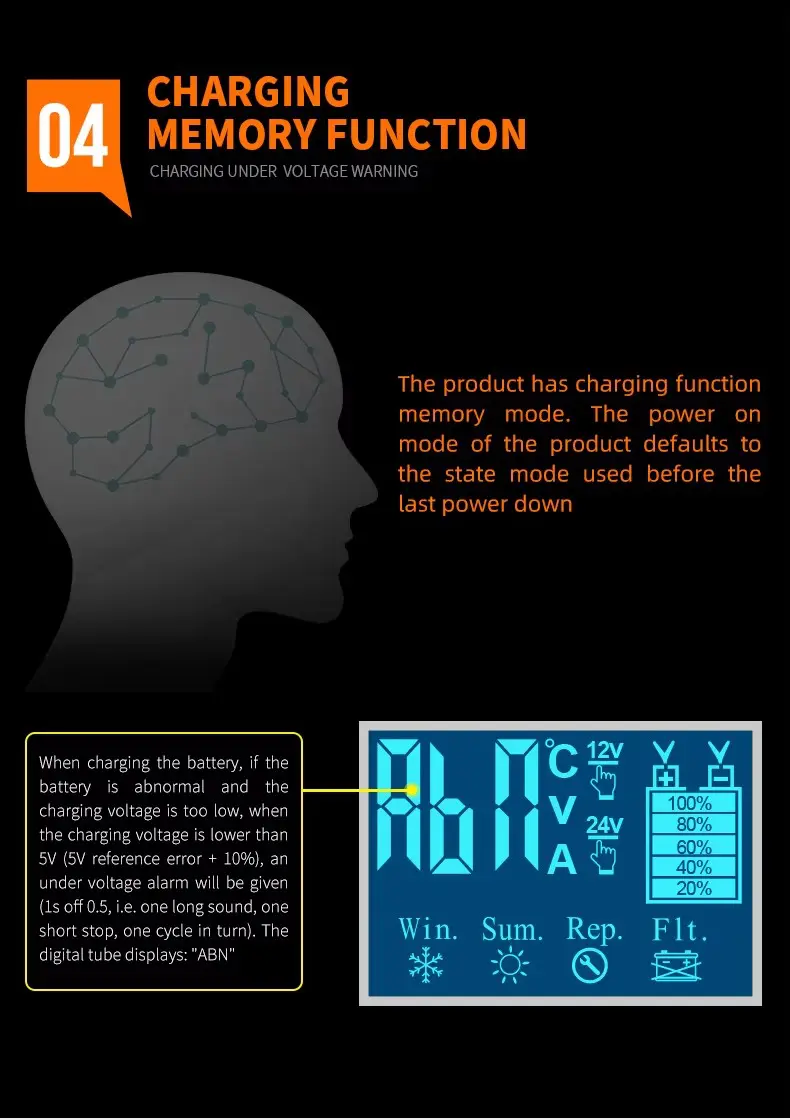 CHARGE AUTOMATIQUE EN 7 ÉTAPES : Il s'agit d'un chargeur de batterie entièrement automatique avec 7 étapes de charge.