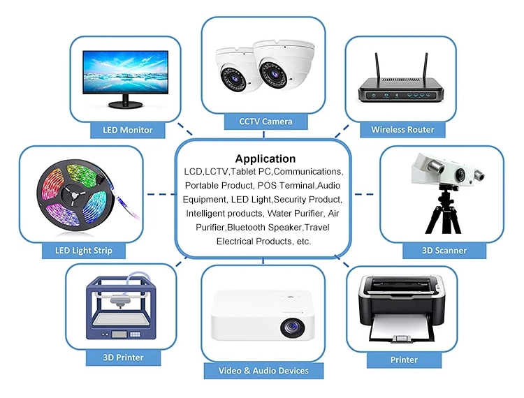 Forte compatibilité des appareils – Adaptateur d'alimentation interchangeable standard 12 V 5 A, interface CC standard internationale 5,5 × 2,1 mm, compatible avec plus de 90 % des routeurs, appareils de surveillance, bandes lumineuses LED et autres équipements. Cet appareil peut être utilisé à plusieurs fins, résolvant ainsi le problème de l’accumulation excessive d’adaptateurs inutilisés à la maison.