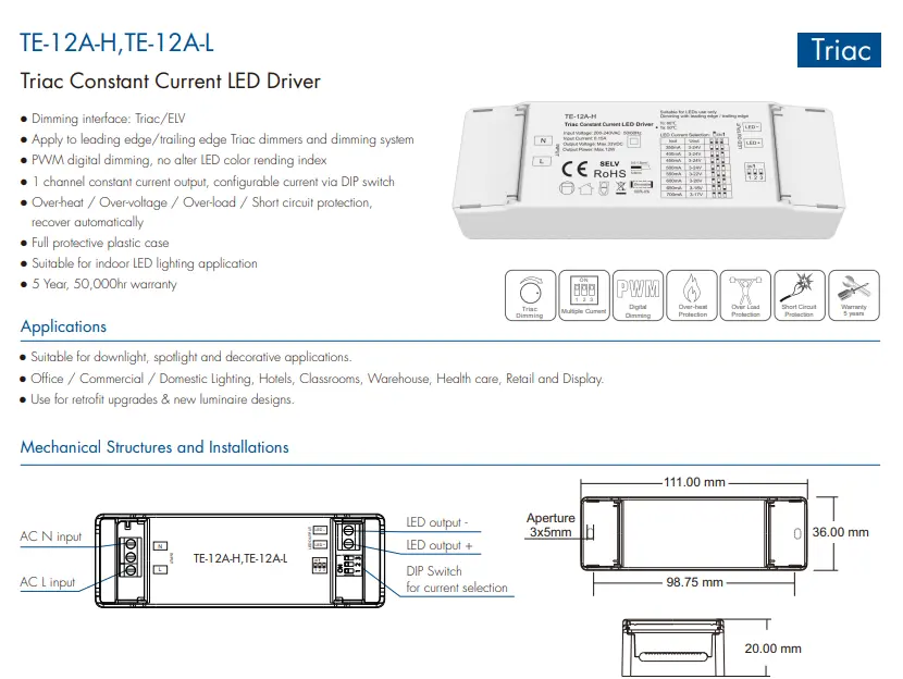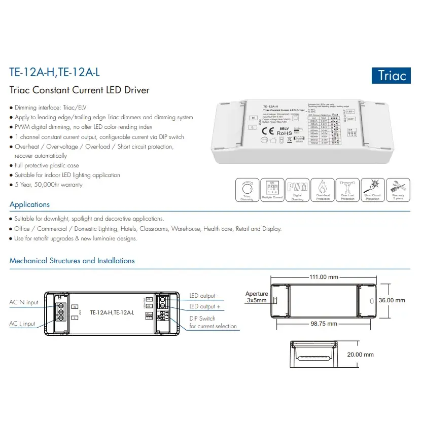 Le pilote LED à gradation triac à courant constant 12 W de haute qualité Starwell intègre des fonctions de protection contre les surtensions, les surintensités et les courts-circuits, et présente un facteur de puissance élevé et une faible distorsion harmonique, répondant à plusieurs normes internationales d'efficacité énergétique et de sécurité. Sa conception compacte le rend facile à installer et adapté à divers scénarios d'éclairage intérieur tels que les downlights, les spots et les lumières décoratives, ce qui en fait une solution de pilote idéale pour les rénovations économes en énergie et les applications d'éclairage intelligent. ProduitCaractéristiques: