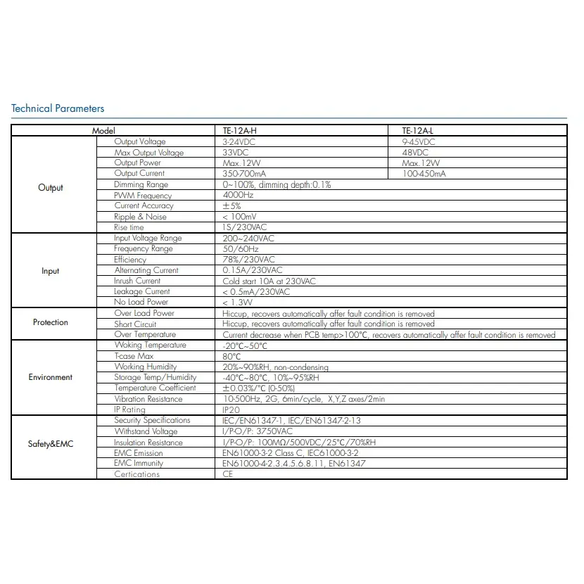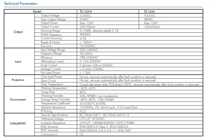 Tension d'entrée : 200-240 VAC 50-60 Hz Courant d'entrée: 0,15A Puissance de sortie : 12 watts maximum Tension de sortie : 9 ~ 42 V Garantie : 2 ans Certificat: CE/Rohs