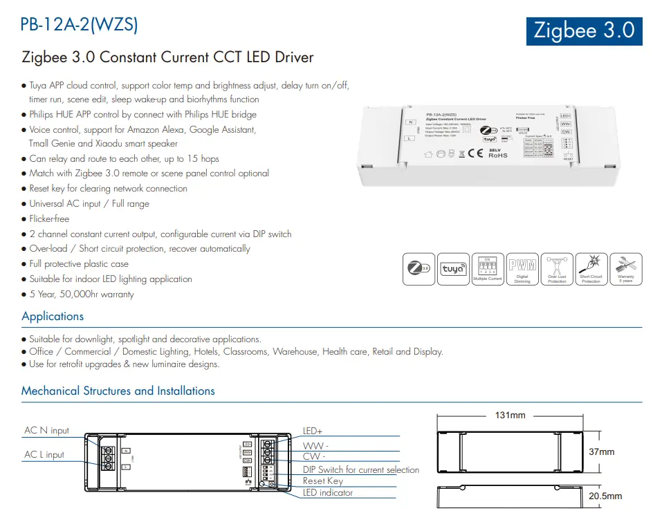 Les pilotes de LED à intensité variable TUYA Zigbee CCT 12 W présentent une efficacité de conversion élevée jusqu'à 85 %, un facteur de puissance ≥ 0,90 et une faible consommation d'énergie à vide, réduisant efficacement le gaspillage d'énergie. Des protections complètes intégrées, notamment contre les surtensions, les surintensités, les courts-circuits et les surchauffes, garantissent un fonctionnement sûr et stable. Adoptant un boîtier compact et résistant au feu, il est largement utilisé dans les systèmes d'éclairage blanc réglables pour les maisons intelligentes, les hôtels, les bureaux et les commerces de détail, offrant des performances de gradation intelligentes fiables et conviviales.
