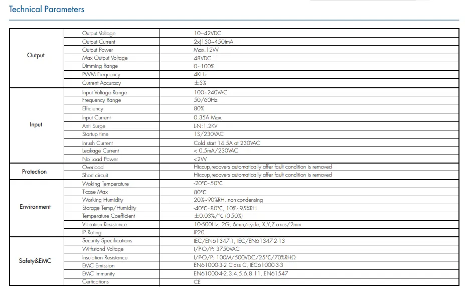 Avec une entrée universelle de 100 ~ 240 VAC, le driver LED à intensité variable CCT s'adapte aux réseaux électriques mondiaux. Haute efficacité jusqu'à 85 % et facteur de puissance ≥0,90, consommation d'énergie et génération de chaleur réduites, prolongeant la durée de vie du pilote et des LED.