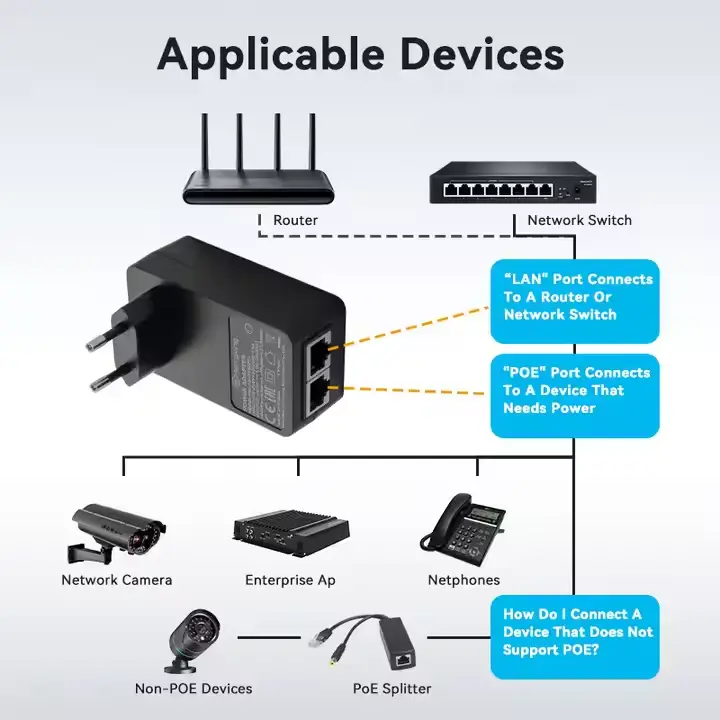 Fournit une alimentation fiable pour les téléphones VoIP et les appareils de communication, garantissant une communication vocale stable.