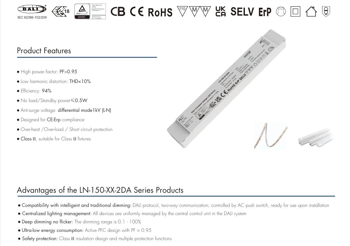 Double isolation : le driver LED à tension constante DALI CCT 150 W 24 V est composé d'une isolation de base et d'une isolation supplémentaire, formant deux couches indépendantes de protection d'isolation, même si une couche tombe en panne, l'autre couche peut toujours empêcher les chocs électriques.