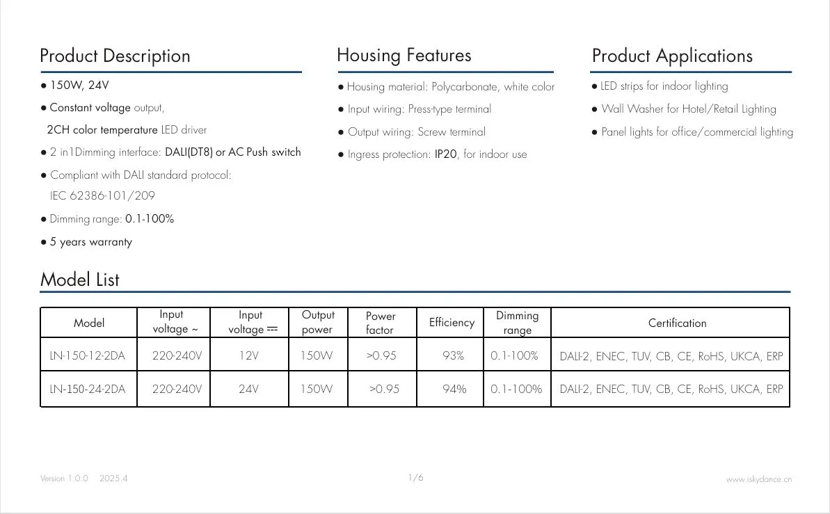 Driver LED à intensité variable DALI CCT à tension constante de 150 W