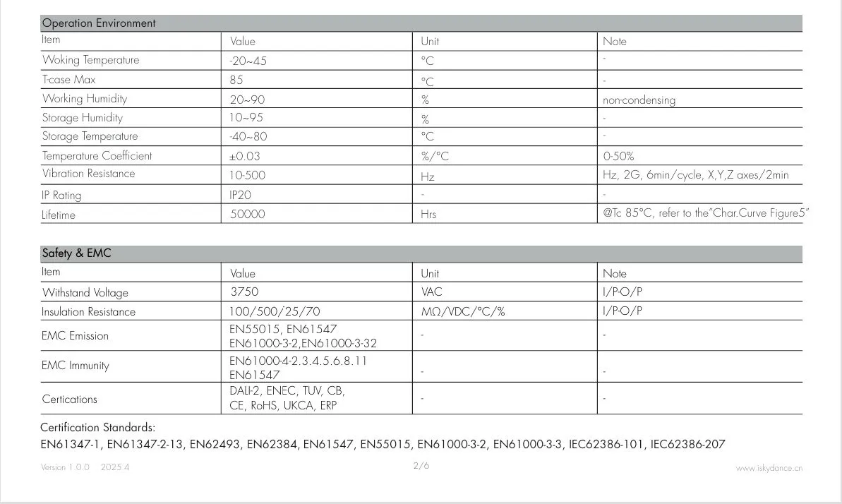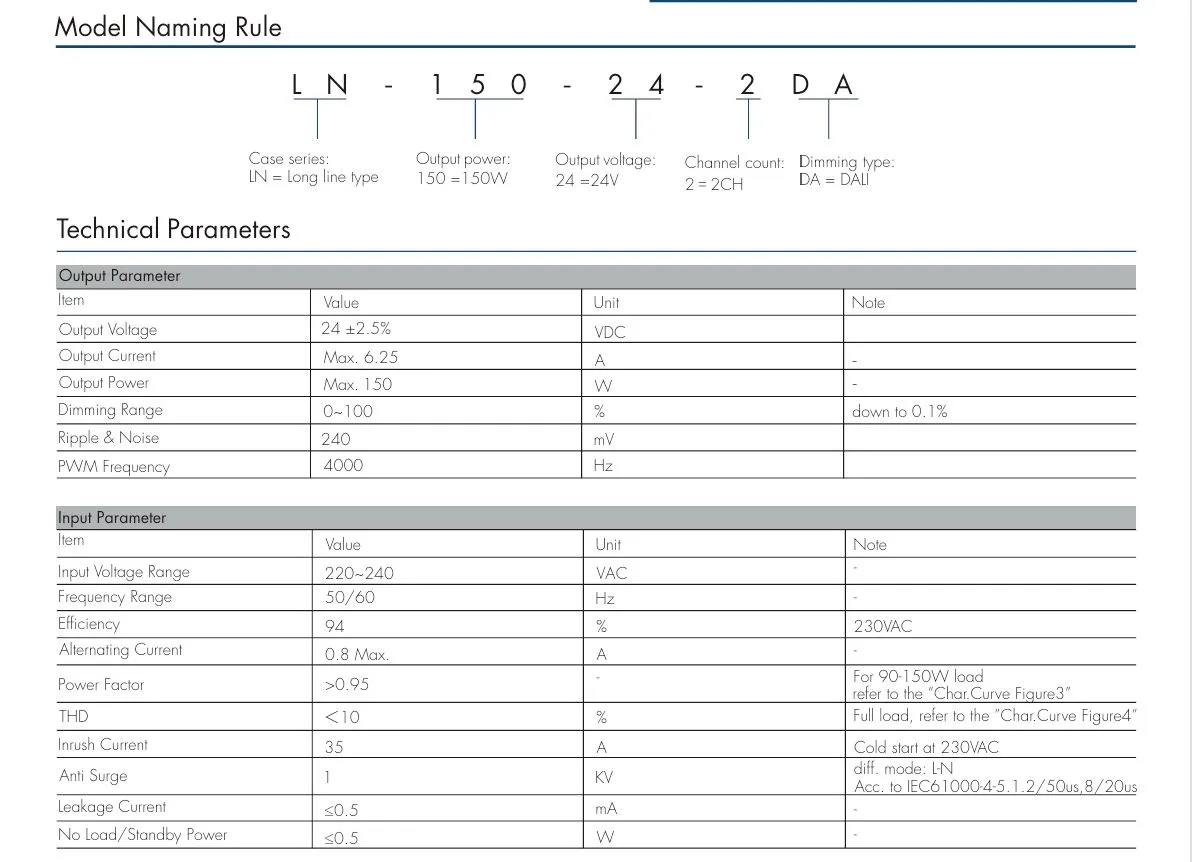 Interface de gradation Gradation 0/1-10 V : plage de gradation 0-10 V ou 1-10 V, consommation de courant du connecteur de gradation ≤ 0,3 mA, courbe de gradation se référer à la « Courbe de caractères Figure 6-7 », Courbe CCT, reportez-vous à la « Courbe char. Figure 8 ». Gradation par interrupteur poussoir : plage de tension 220 ~ 240VAC 50/60Hz.