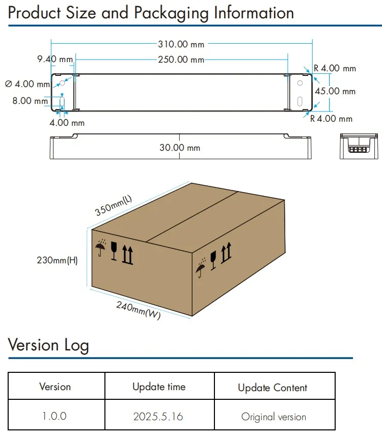 Fonction de protection Surchauffe : diminution du courant lorsque la température du PCB > 100 ° C, récupération automatique une fois la condition de défaut supprimée. Court-circuit : coupez la tension de sortie, récupère automatiquement une fois la condition de défaut supprimée.