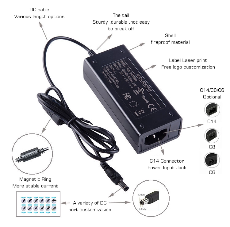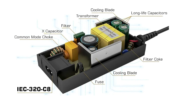 L'adaptateur secteur de bureau STARWELL 150 W est doté d'un port d'entrée d'alimentation standard IEC C6 et d'un connecteur de sortie CC 5,5 x 2,1 mm, qui sert de solution d'alimentation professionnelle pour les appareils haute puissance. La précision de sortie de tension de l'adaptateur secteur AC/DC 150 W atteint ± 2 % et l'efficacité de conversion de puissance dépasse 90 %. Il a passé les certifications CE et FCC pour garantir la sécurité. L'adaptateur secteur STARWELL est idéal pour alimenter des appareils dans des scénarios de bureau, de divertissement et commerciaux, c'est une alternative économique aux adaptateurs d'origine ou une extension pour les besoins d'alimentation de plusieurs appareils.