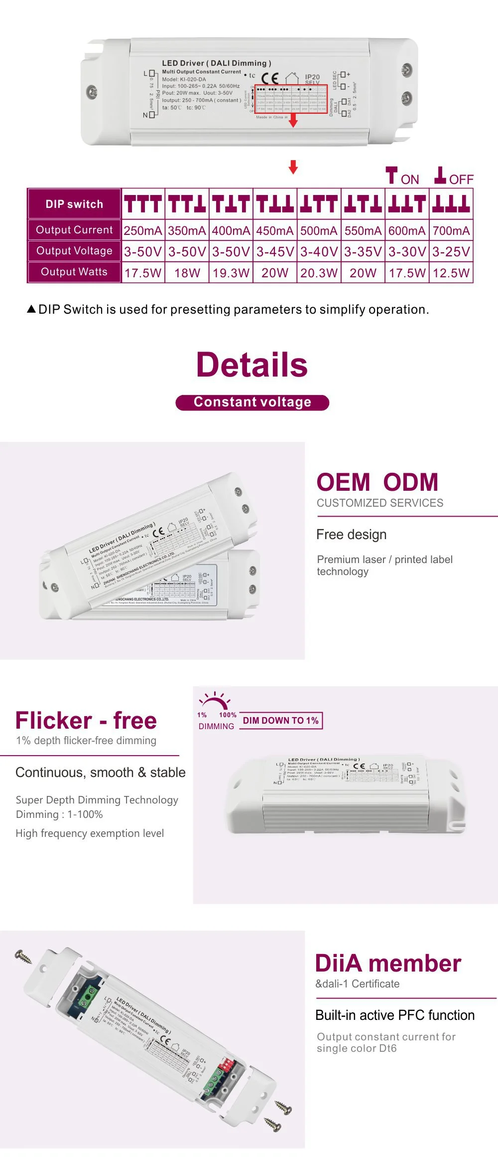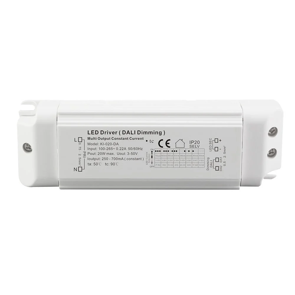 En tant qu'alimentation à courant constant à gradation Dali fiable de 20 W pour les lumières LED, elle garantit un courant constant pur et sans scintillement pour les modules LED ou les bandes lumineuses. Le boîtier du produit adopte un boîtier en plastique à courant constant AC-DC pour pilote LED à intensité variable 20 W pour l'éclairage LED, doté d'une structure compacte et robuste avec d'excellentes performances de dissipation thermique et prend en charge une installation intégrée et externe.