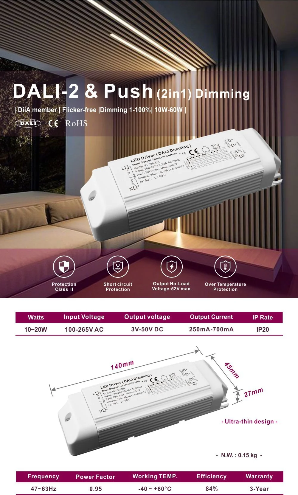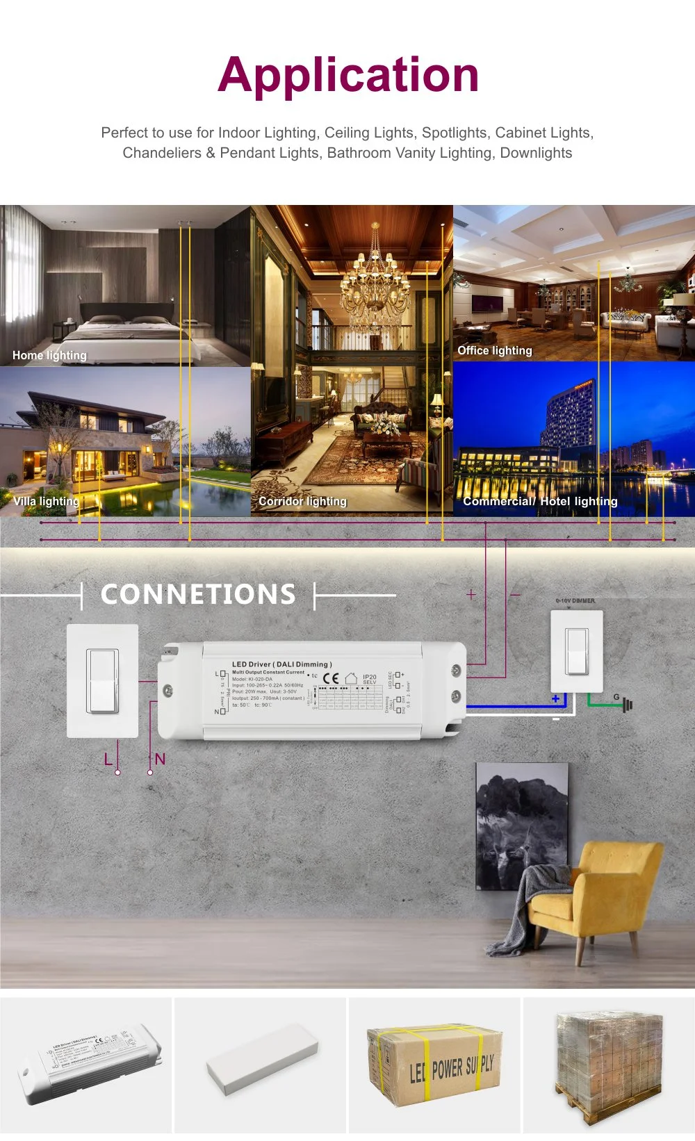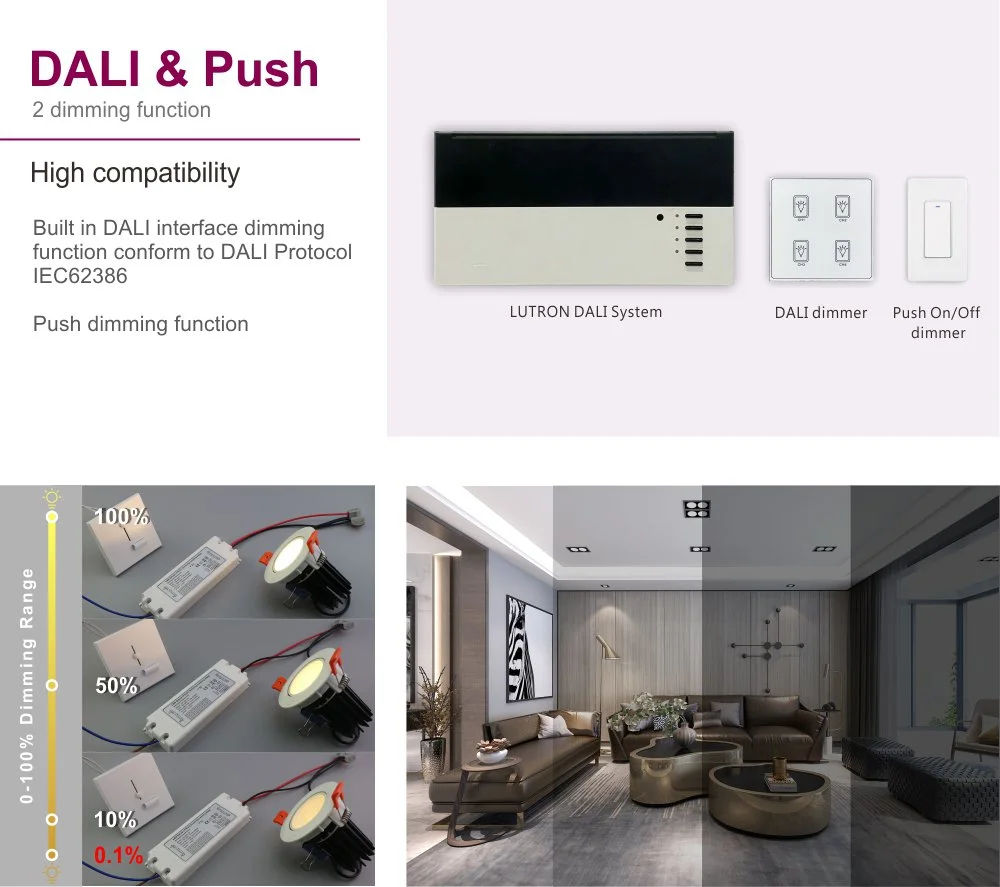 Sa conception compacte facilite l'installation et l'intégration, offrant une protection complète contre les surtensions, les surchauffes et les courts-circuits. Le produit convient aux lieux tels que les musées, les bureaux et les hôtels qui nécessitent un contrôle intelligent de l'éclairage basé sur la scène, et constitue une solution de pilote idéale pour réaliser des économies d'énergie efficaces et une gestion flexible de l'environnement lumineux.