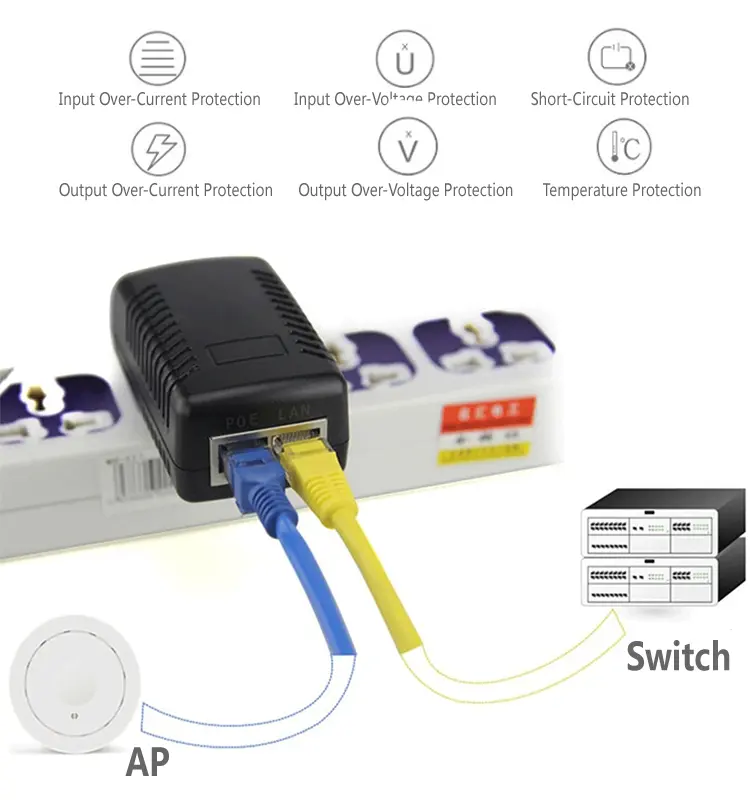 L'injecteur POE à 2 ports fournit une tension et un courant stables avec une faible ondulation, garantissant un fonctionnement stable à long terme. La large tension d'entrée de 100 à 240 V CA s'adapte aux réseaux électriques mondiaux. La protection intégrée contre les surtensions, les surintensités, les courts-circuits et les surchauffes protège à la fois l'injecteur POE à double port et l'équipement connecté.