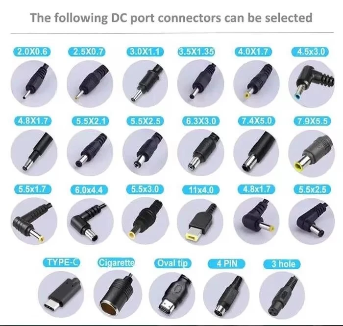 3. Compatibilité des connecteurs : vérifiez que la fiche de sortie CC de l'adaptateur a la polarité (souvent positive au centre) et la taille physique (par exemple, 5,5 mm x 2,1 mm) pour s'adapter en toute sécurité à la prise d'alimentation de votre appareil.
