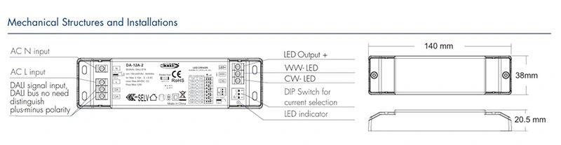 Ce driver de LED à intensité variable DALI CCT à tension constante de 30 W est conforme au protocole DALI-2 DT8, prenant en charge une gradation CCT ultra-douce et sans scintillement de 0,1 % à 100 % et un contrôle double canal à une adresse. Il s'associe parfaitement à tous les contrôleurs principaux DALI grand public pour la programmation de scènes et le contrôle de groupe, répondant parfaitement aux exigences de régulation précises de l'éclairage intelligent professionnel.
