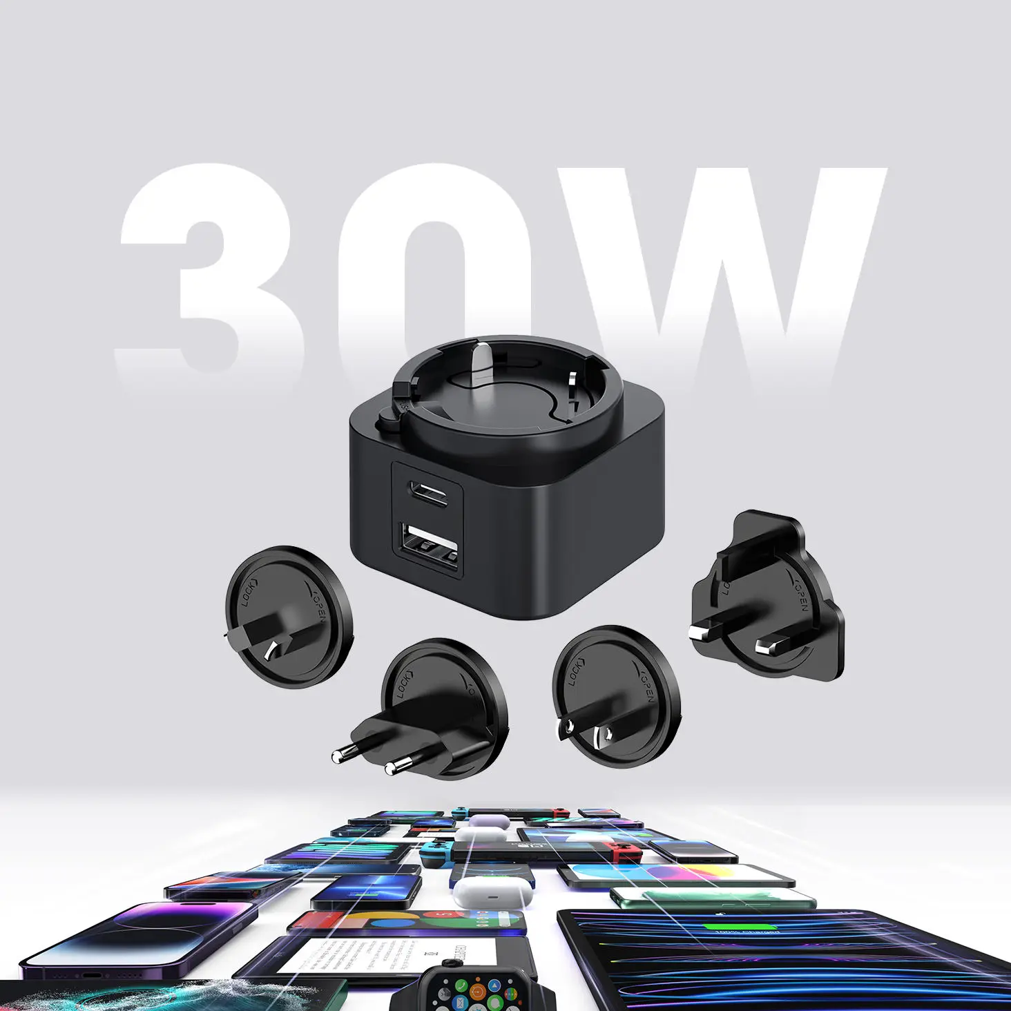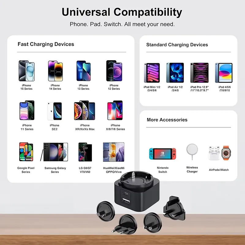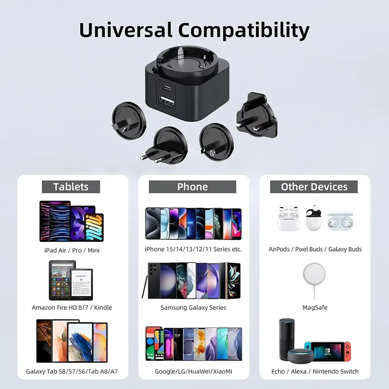 La polyvalence est la clé. La conception à double port (USB-C/USB-A) vous permet de charger deux appareils simultanément. Le chargeur PD à prise interchangeable 30 W comprend un ensemble de prises interchangeables (US/EU/UK/AU), ce qui en fait votre compagnon de voyage idéal à travers le monde. Que vous chargez un smartphone, une tablette ou un ordinateur portable, la compatibilité universelle garantit des performances de premier ordre.