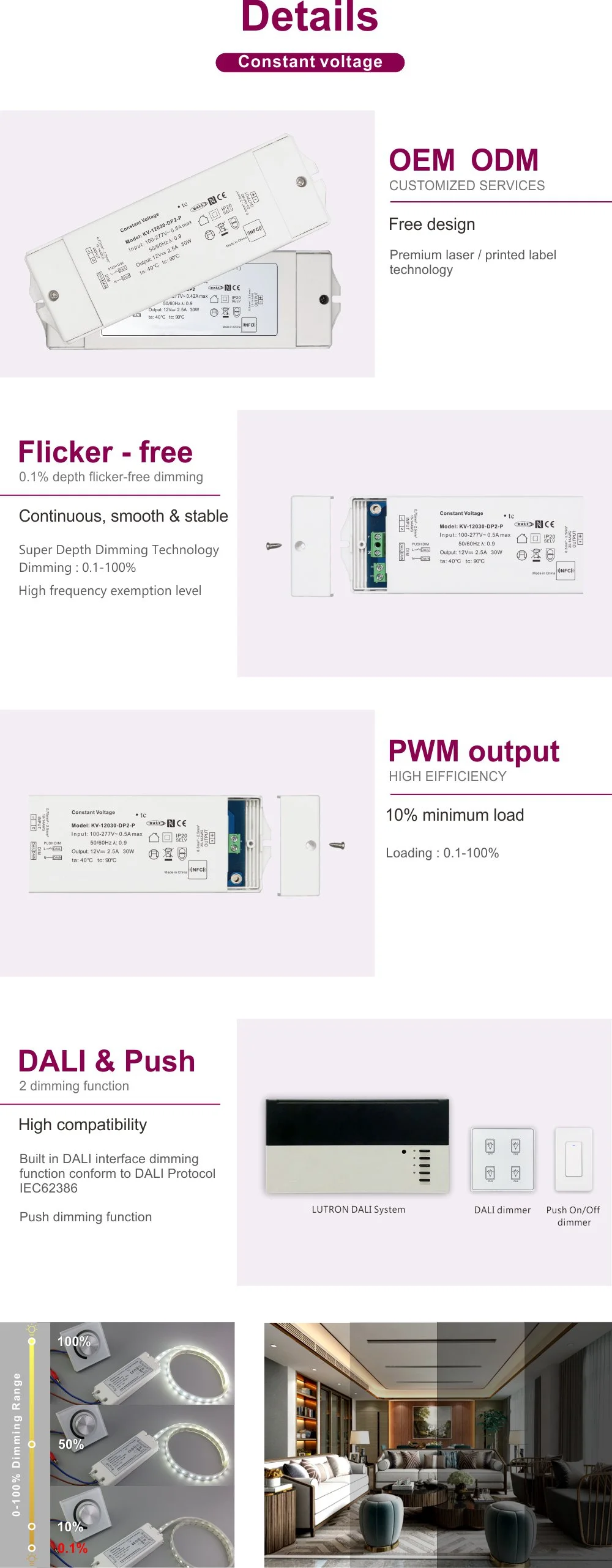 Le driver de LED dimmable DALI 36 V à tension constante de 30 W, avec sa sortie de tension constante stable, sa puissante capacité de contrôle du protocole DALI, son effet de lumière sans scintillement de haute qualité, sa large adaptabilité de tension et sa certification de sécurité fiable, fournit un « cœur » puissant et intelligent pour diverses applications d'éclairage LED.
