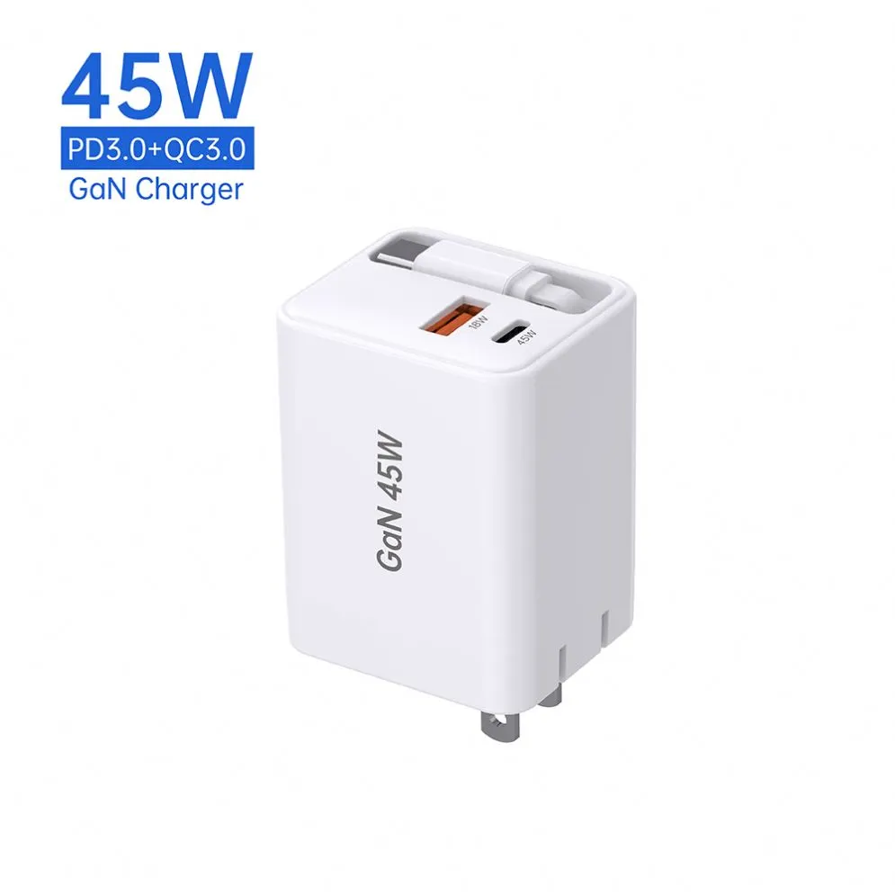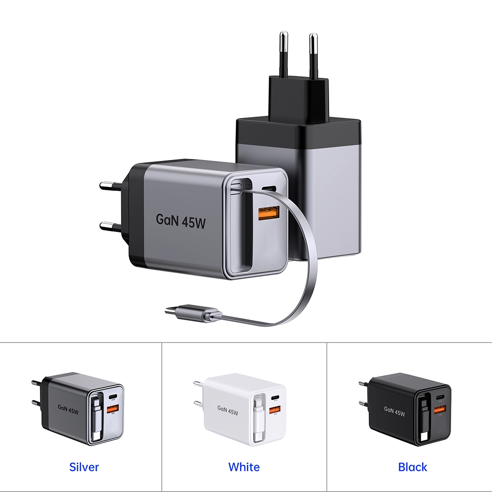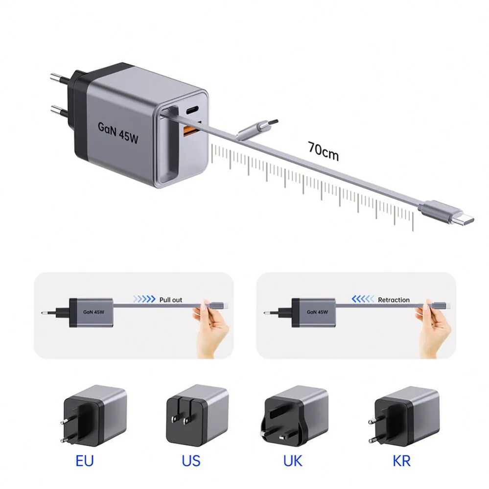Chargement à grande vitesse : le chargeur rapide rétractable GAN 45 W offre une puissance puissante de 45 watts, garantissant une charge rapide de vos appareils.