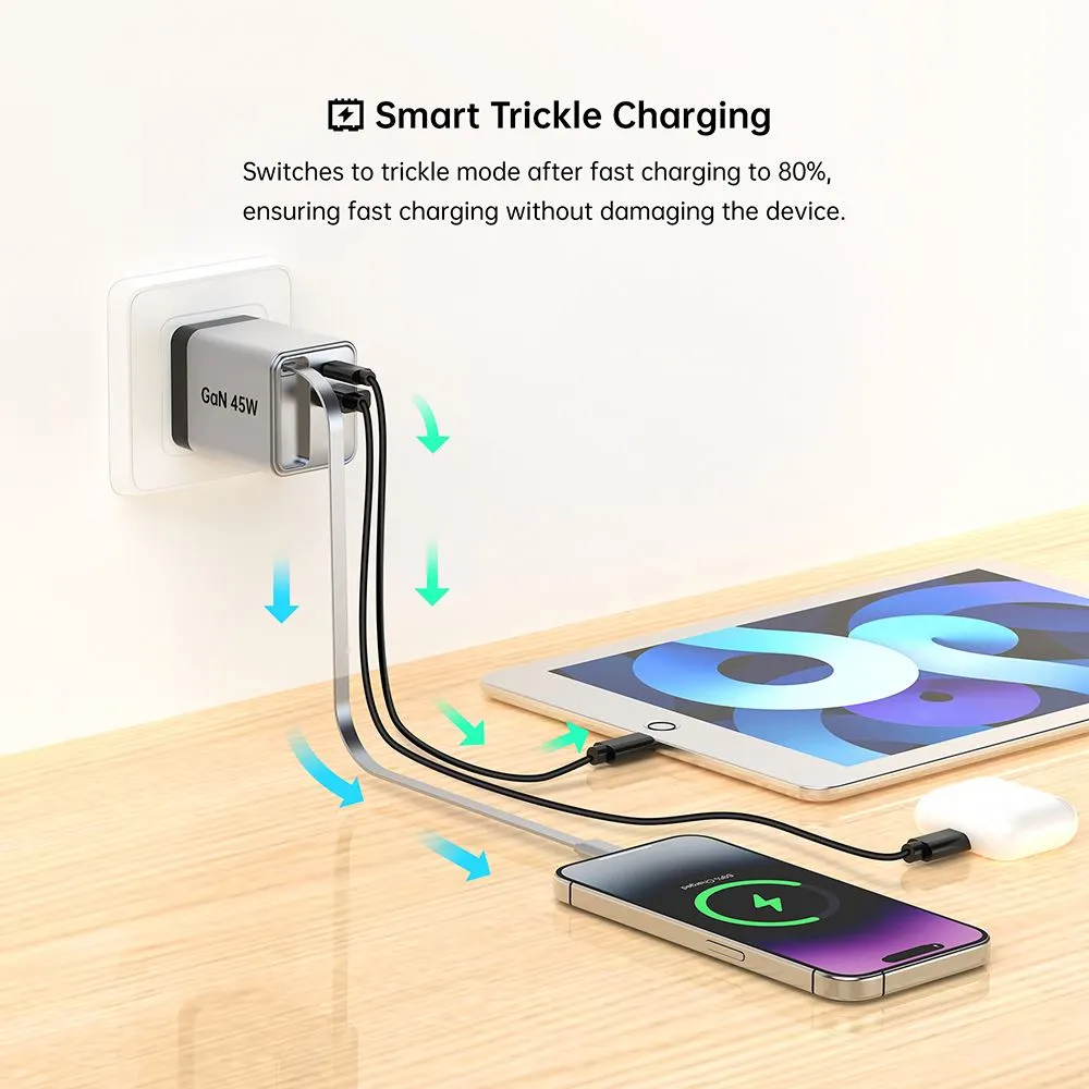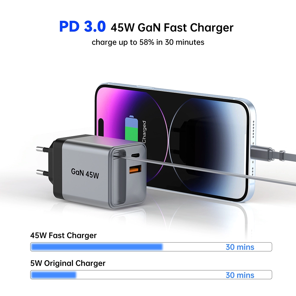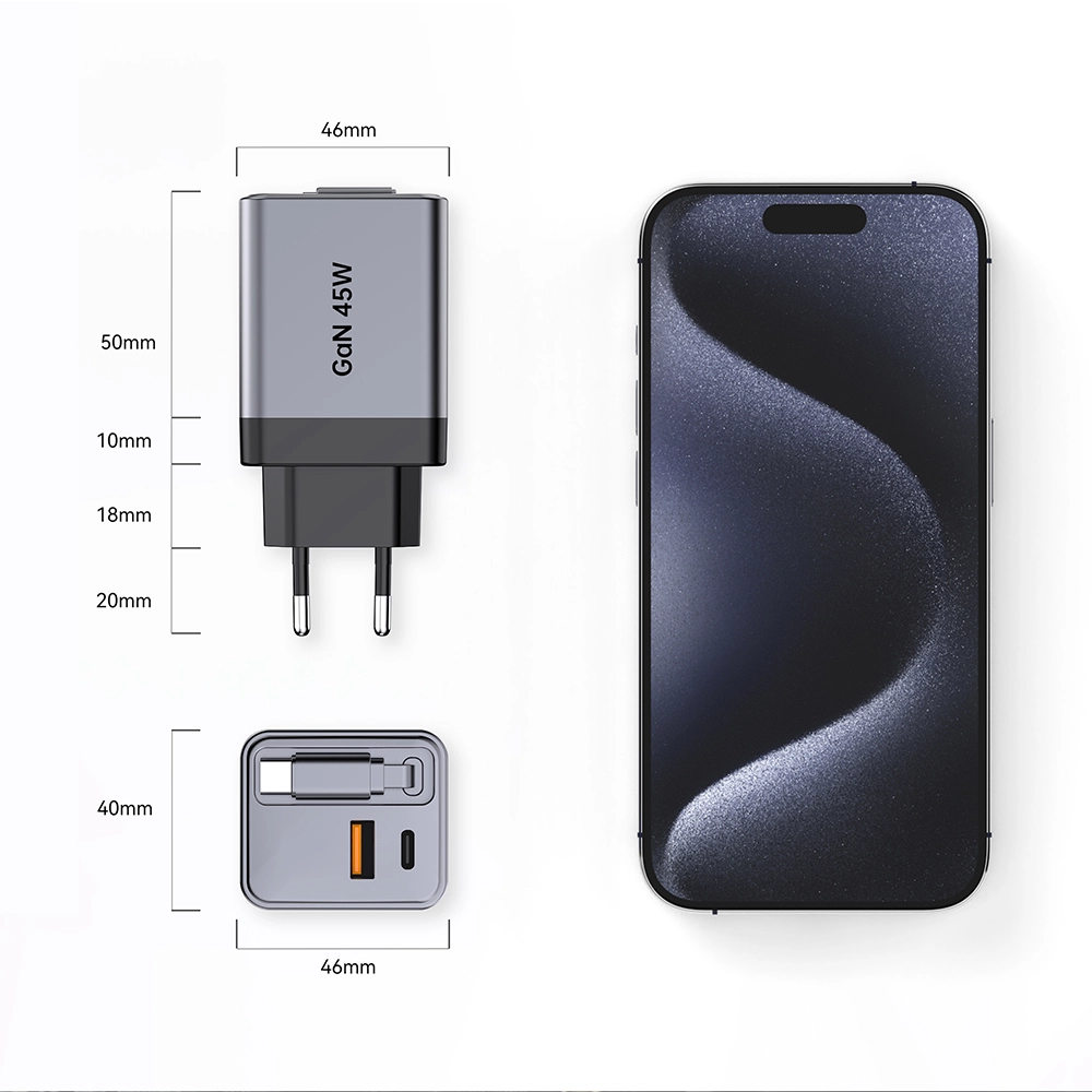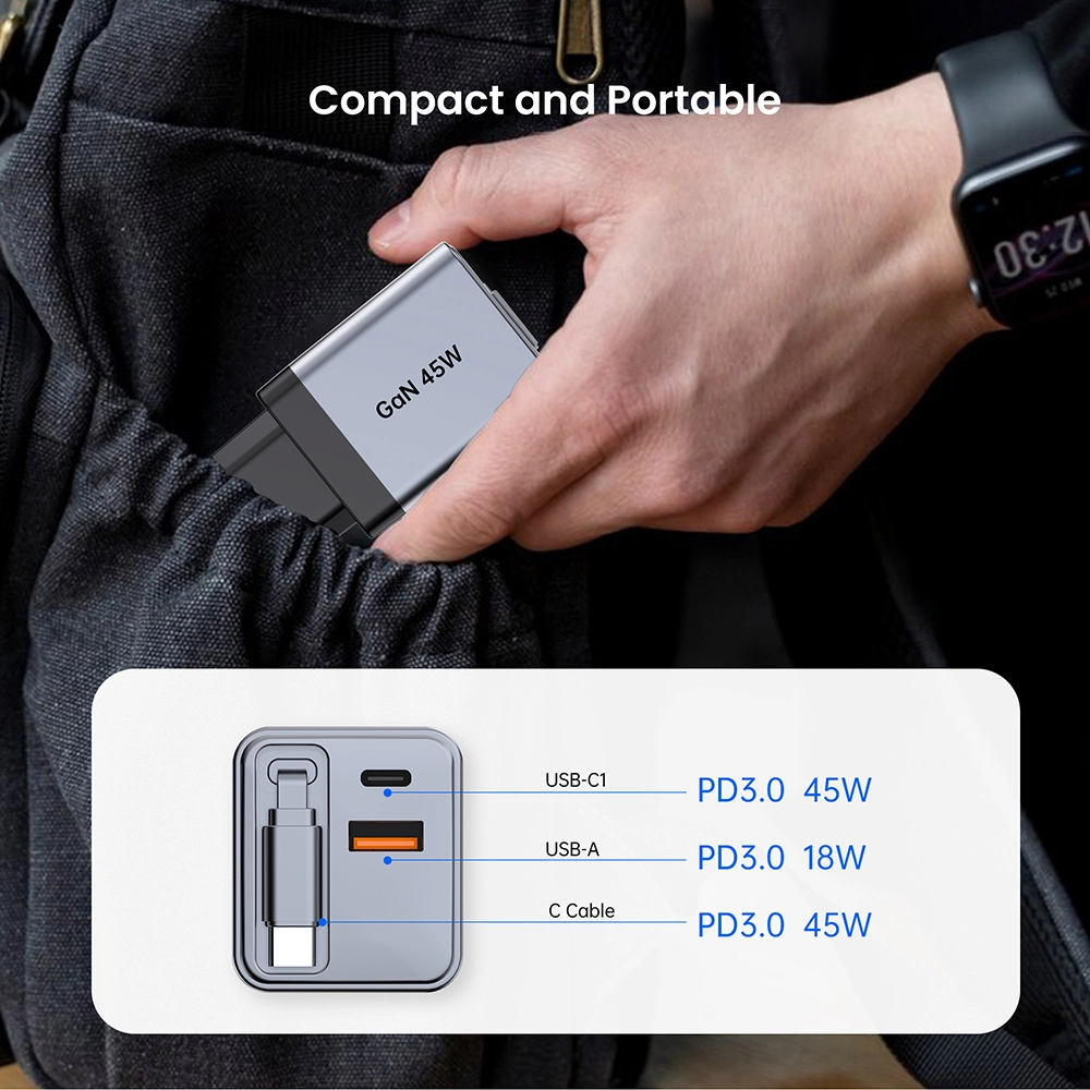 Chargement à grande vitesse : le chargeur rapide rétractable GAN 45 W offre une puissance puissante de 45 watts, garantissant une charge rapide de vos appareils.