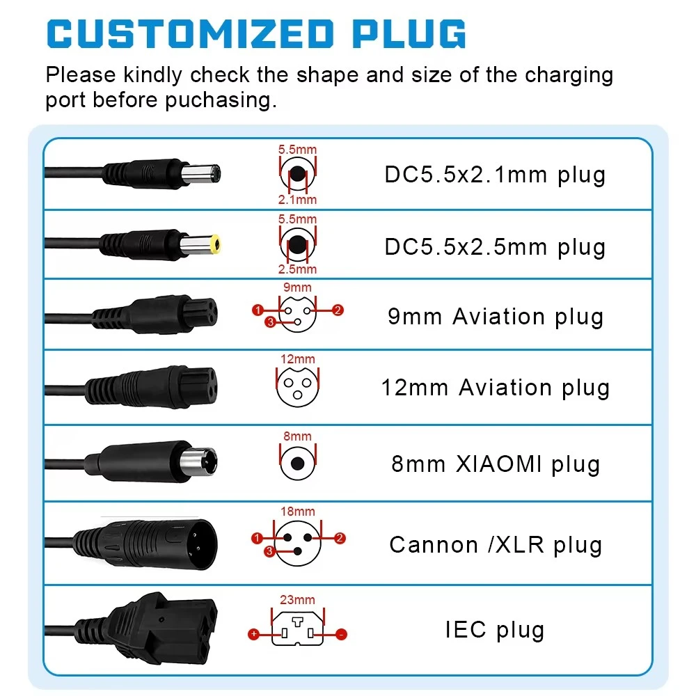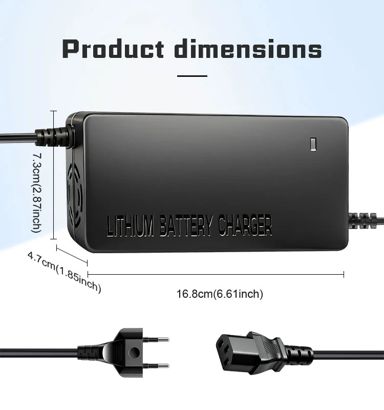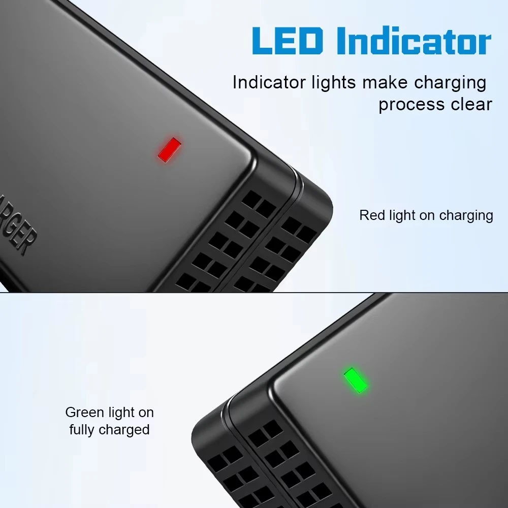 Malgré ses performances robustes, le chargeur présente une conception compacte et légère qui le rend facile à transporter. Que vous ayez besoin d'un chargeur pour la maison, le bureau ou à garder dans votre sac à dos pour des recharges en déplacement, sa portabilité vous garantit d'avoir toujours accès à une alimentation sûre et fiable. Durable et convivial, ce chargeur 48 V est le compagnon d'alimentation idéal pour maintenir la santé et les performances de vos batteries lithium-ion.