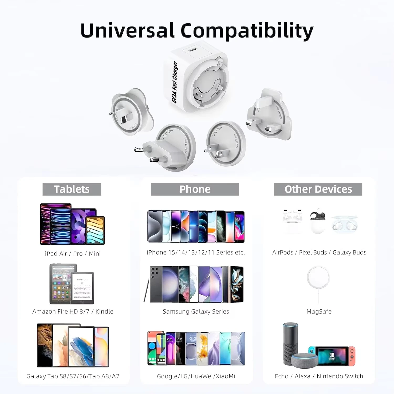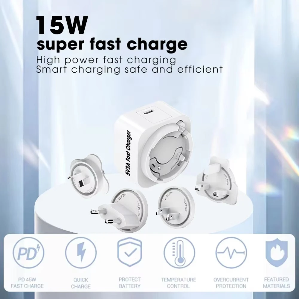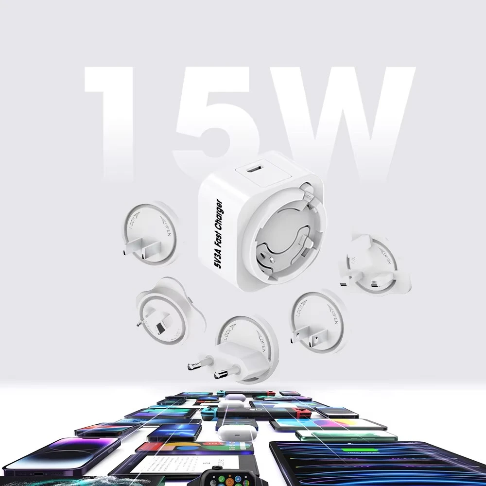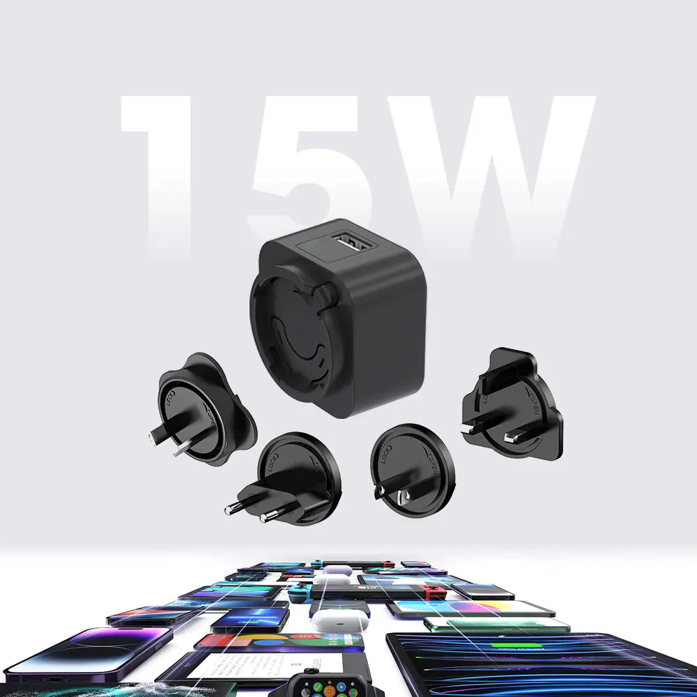 Un ensemble complet de fiches détachables (US/EU/UK/AU/KR/CN) garantit une utilisation transparente dans plus de 150 pays – parfait pour les voyages internationaux et une utilisation quotidienne.