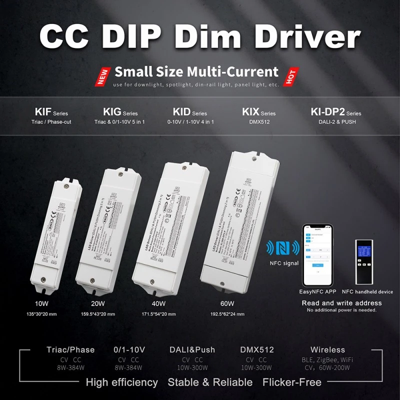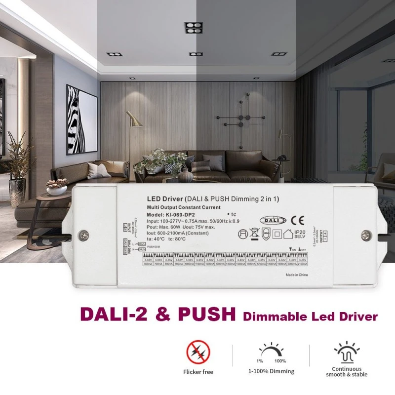 En tant que driver de LED CCT à gradation DALI à courant constant de 60 W, il adopte une technologie avancée de contrôle de courant constant en boucle fermée pour garantir que le courant de sortie (la valeur typique est de 700 mA, qui peut être personnalisée en fonction des exigences du module LED des clients) est très stable. Cette conception évite efficacement l'atténuation de la lumière ou la déviation de couleur causée par les fluctuations de courant dans les LED, garantissant fondamentalement la luminosité et la durée de vie à long terme des lampes. Sa large plage d'entrée de tension et ses caractéristiques de sortie de courant constant le rendent parfaitement compatible avec diverses spécifications de downlights LED, de projecteurs, de panneaux lumineux, d'éclairages linéaires et de modules de bandes lumineuses.