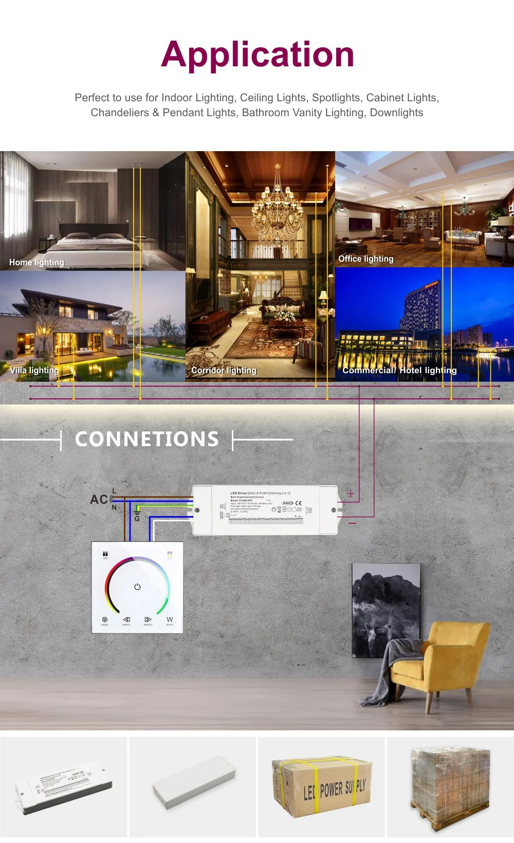 Qu'il s'agisse de panneaux lumineux LED dans les bureaux, de downlights LED dans les centres commerciaux, de bandes lumineuses cachées dans les couloirs d'hôtel ou d'un éclairage d'accentuation dans les espaces domestiques, ce driver est le choix idéal. Le boîtier compact en alliage d'aluminium avec enrobage complet assure une excellente gestion de la chaleur et un fonctionnement stable à long terme. Les multiples circuits de protection intégrés contre les surtensions, les surintensités, les courts-circuits et la surchauffe offrent une protection de sécurité complète pour l'ensemble du système d'éclairage.