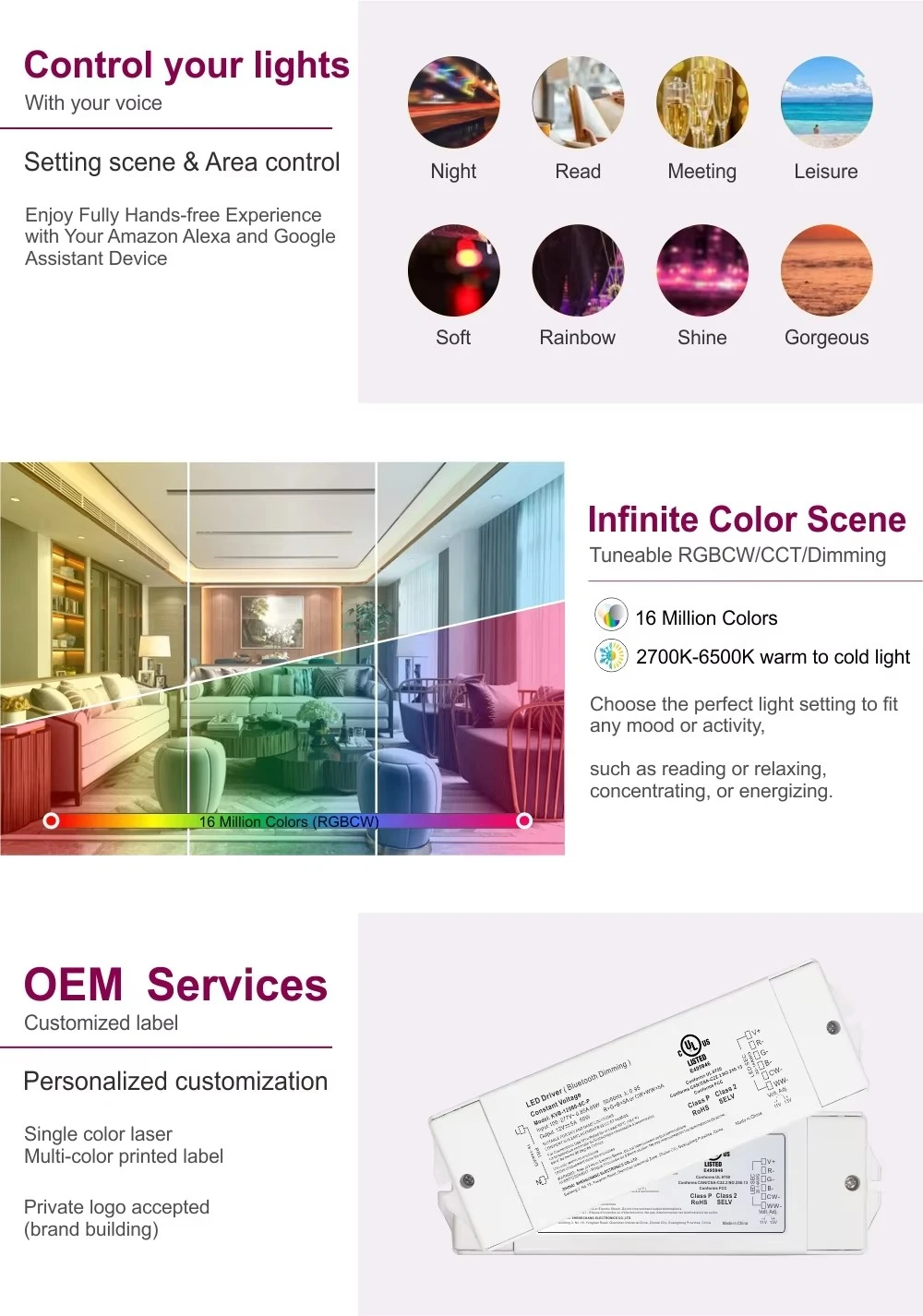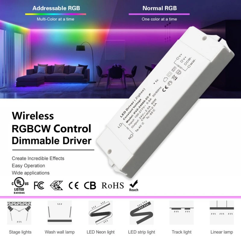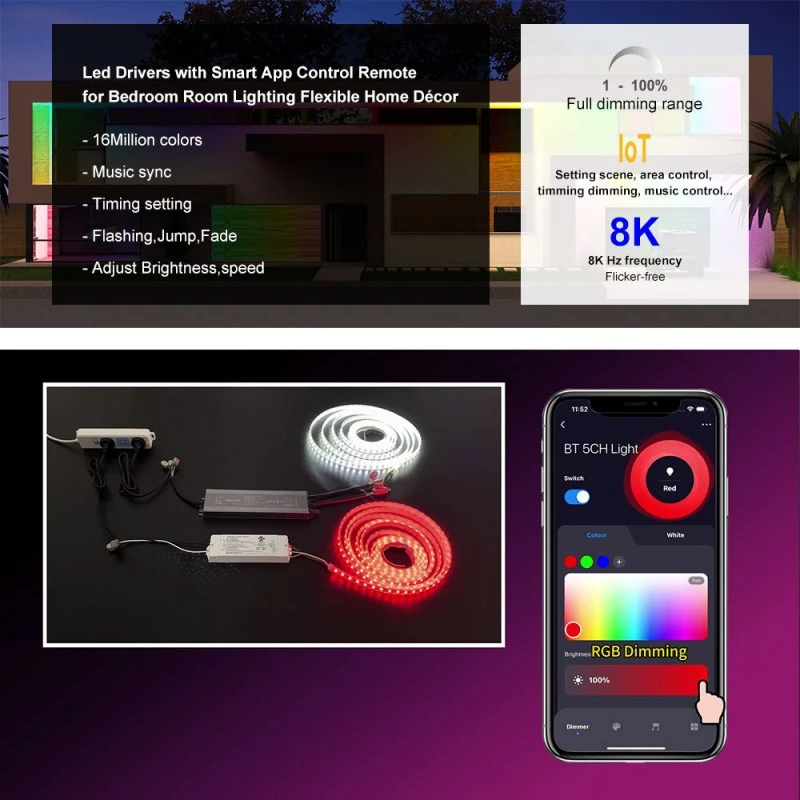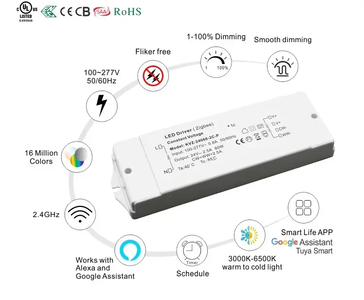Gradation intelligente à portée de main Doté d'un module sans fil ZigBee intégré avec la technologie TUYA, ce pilote offre un contrôle intelligent transparent. Réglez la luminosité via une application mobile ou des commandes vocales via Google Home et Amazon Echo. La sortie PWM haute fréquence 8 K Hz garantit une gradation totalement sans scintillement, tandis que la plage de gradation de 1 à 100 % avec une profondeur de 1 % permet des transitions fluides et une création d'ambiance parfaite.