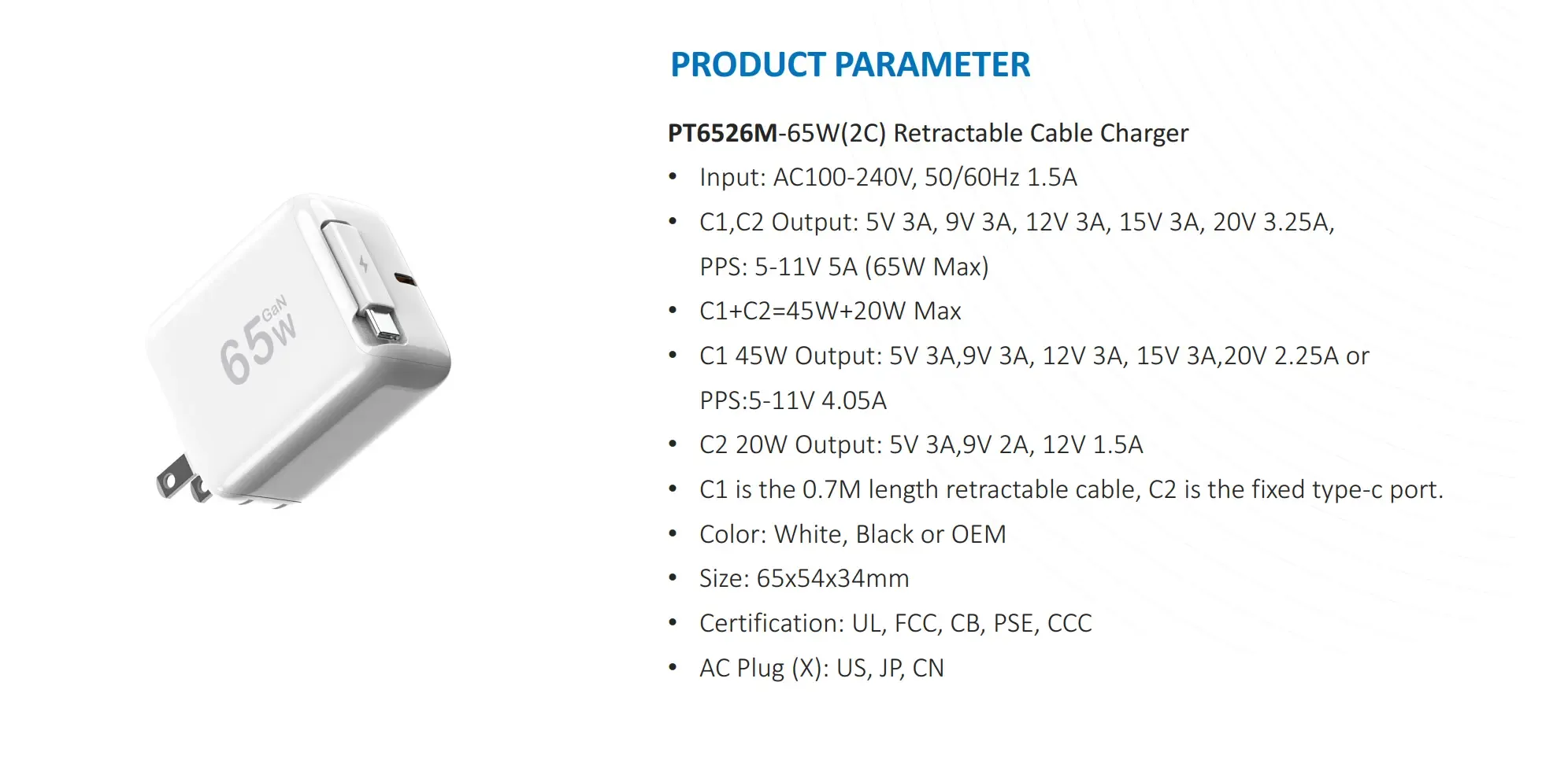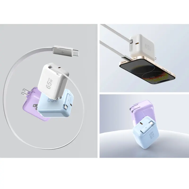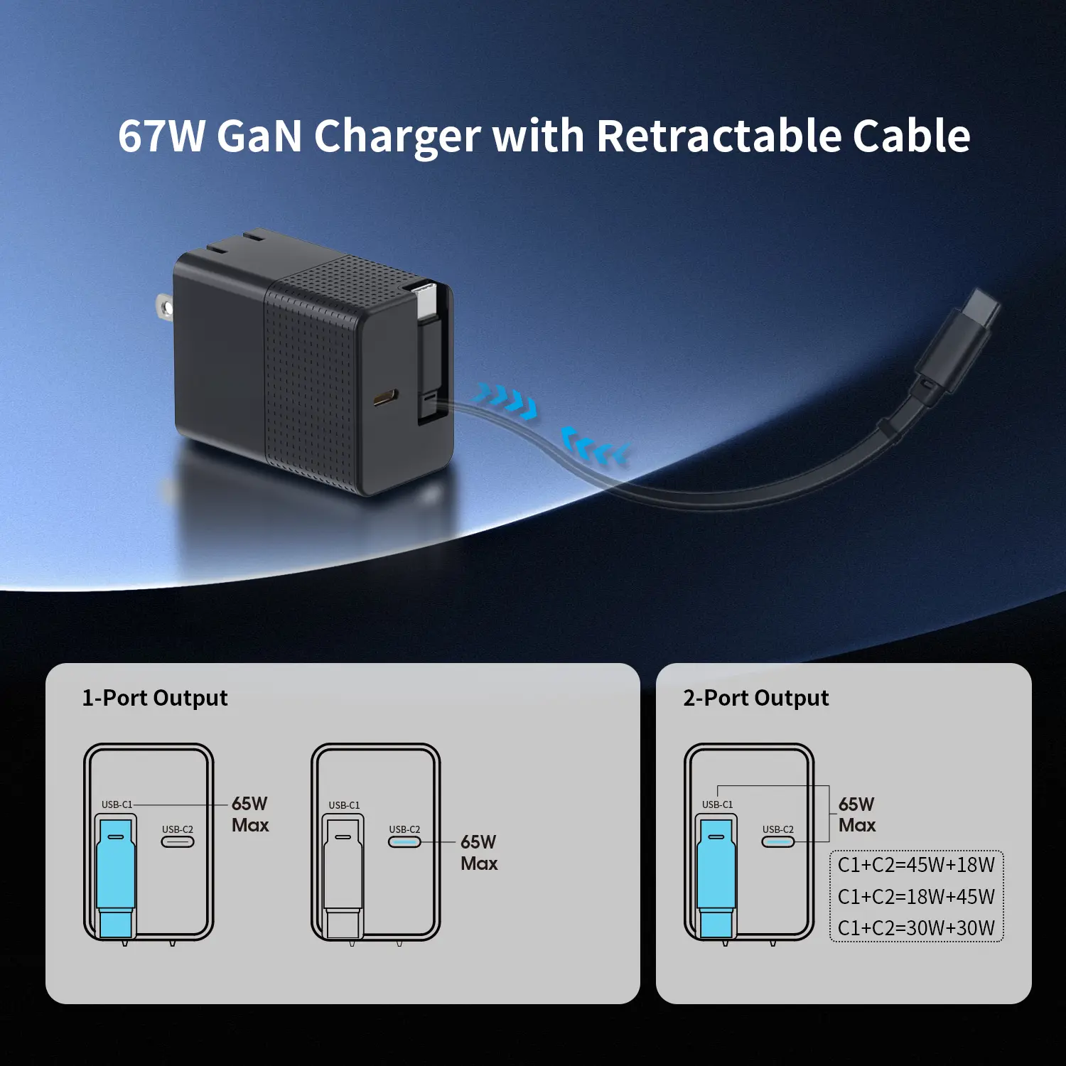 Chargeur PD 65 W avec câble USB C tractable Spécifications :