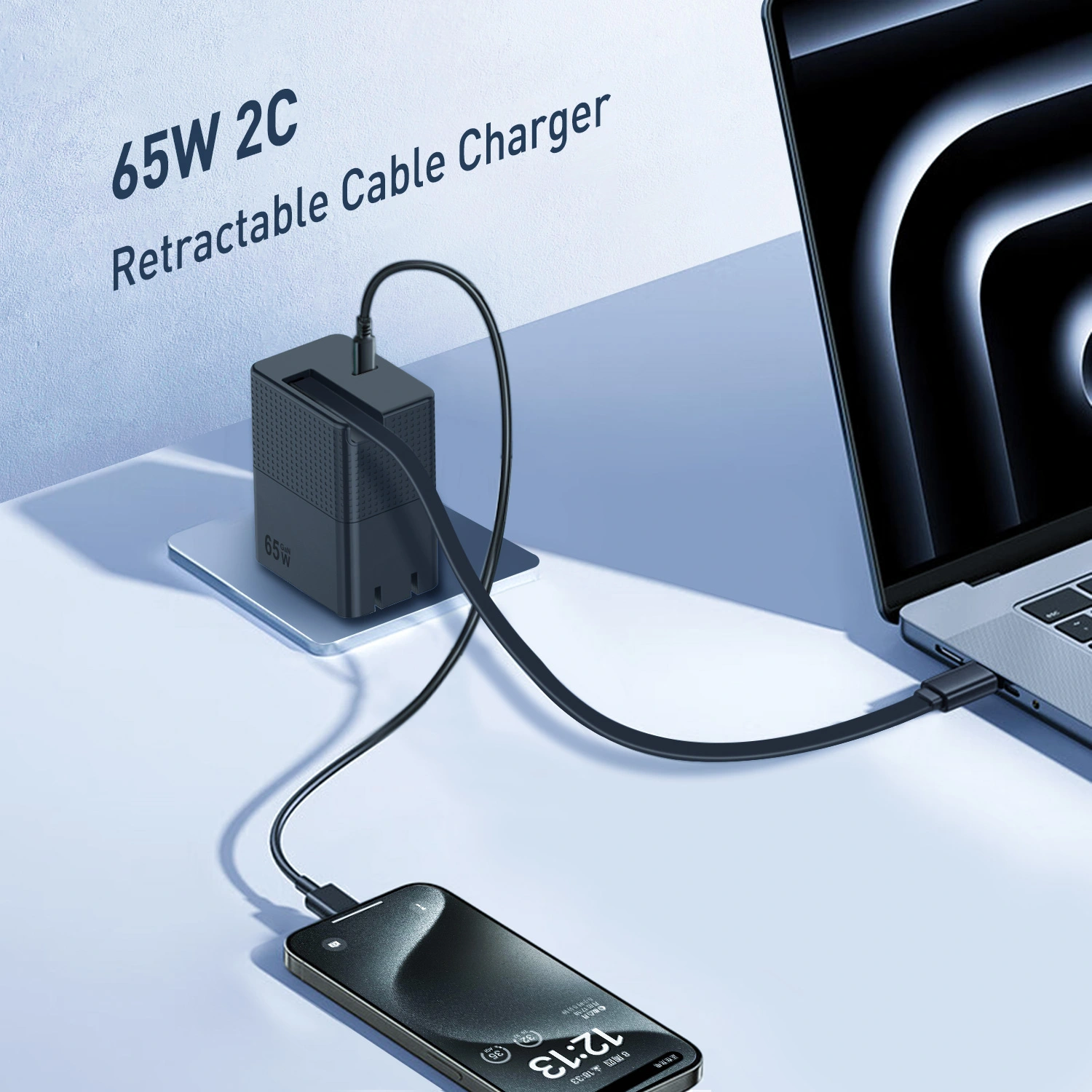 Équipé de câbles rétractables : l'adaptateur de charge rapide 65 W est équipé d'un câble de données USB-C pratique et non emmêlant de 2,3 pieds (1 mètre) de long. Ce câble peut s'étendre et se rétracter en douceur, évitant ainsi l'encombrement des câbles emmêlés et garantissant que vous pouvez charger à tout moment.