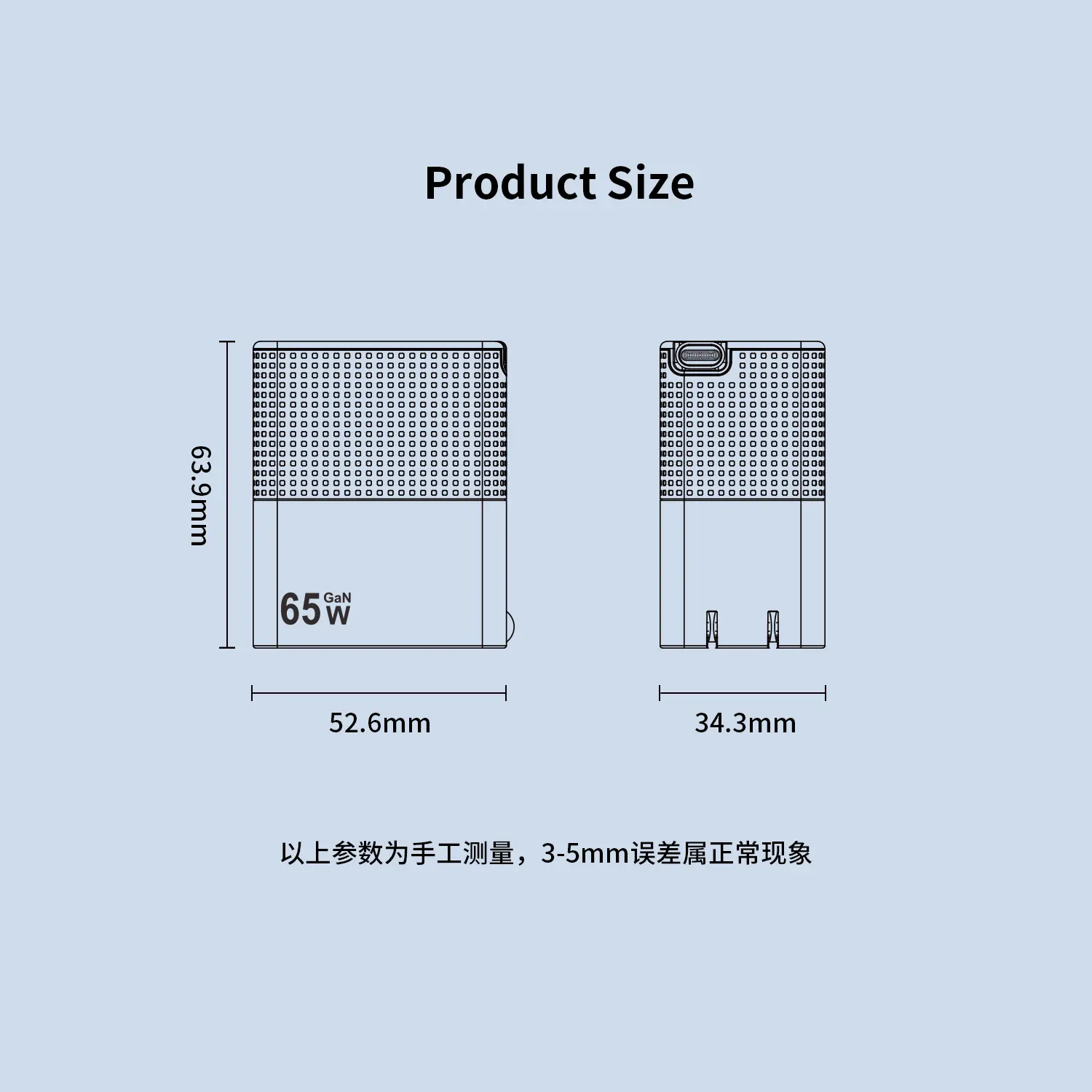 Deux ports USB-C : le chargeur PD 3.0 65 W peut charger deux appareils simultanément. Pendant les deux processus de charge, la puissance est allouée à 45 W et 20 W.