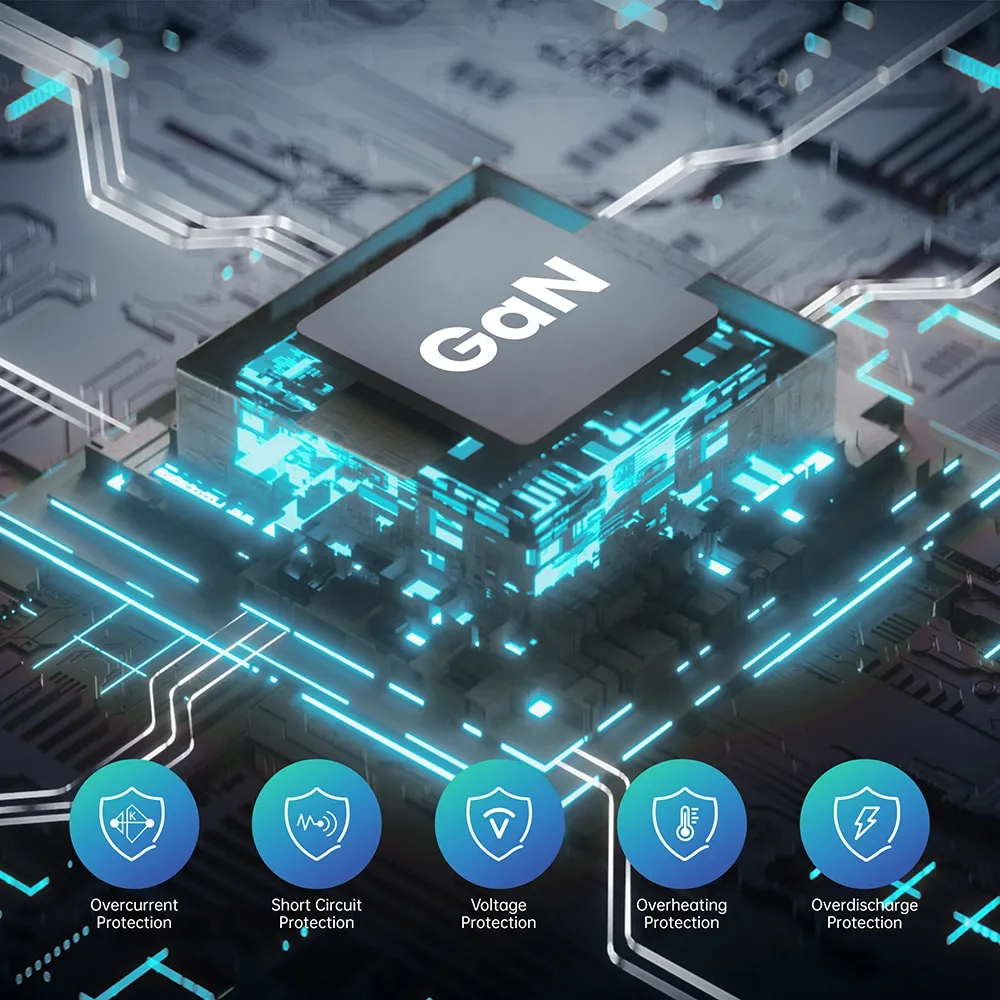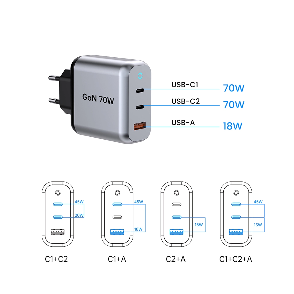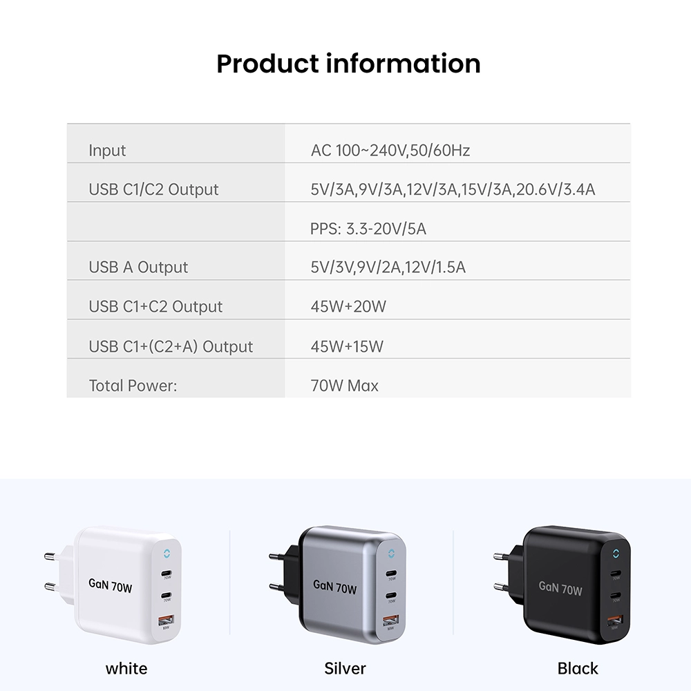 Sortie C1/C2 : 5V3A,9V3A,12V3A,15V3A,20,6V3,4A (70W maximum) PPS : 3,3-11V 4,05A Sortie USB-A : 5V3A,9V2A,12V1,5A 3,3-11V 2A (22W maximum) Sortie C1+C2 : 45W+20W Sortie C1+C2+USB-A : 45W+5V3A Totale : 70 W |