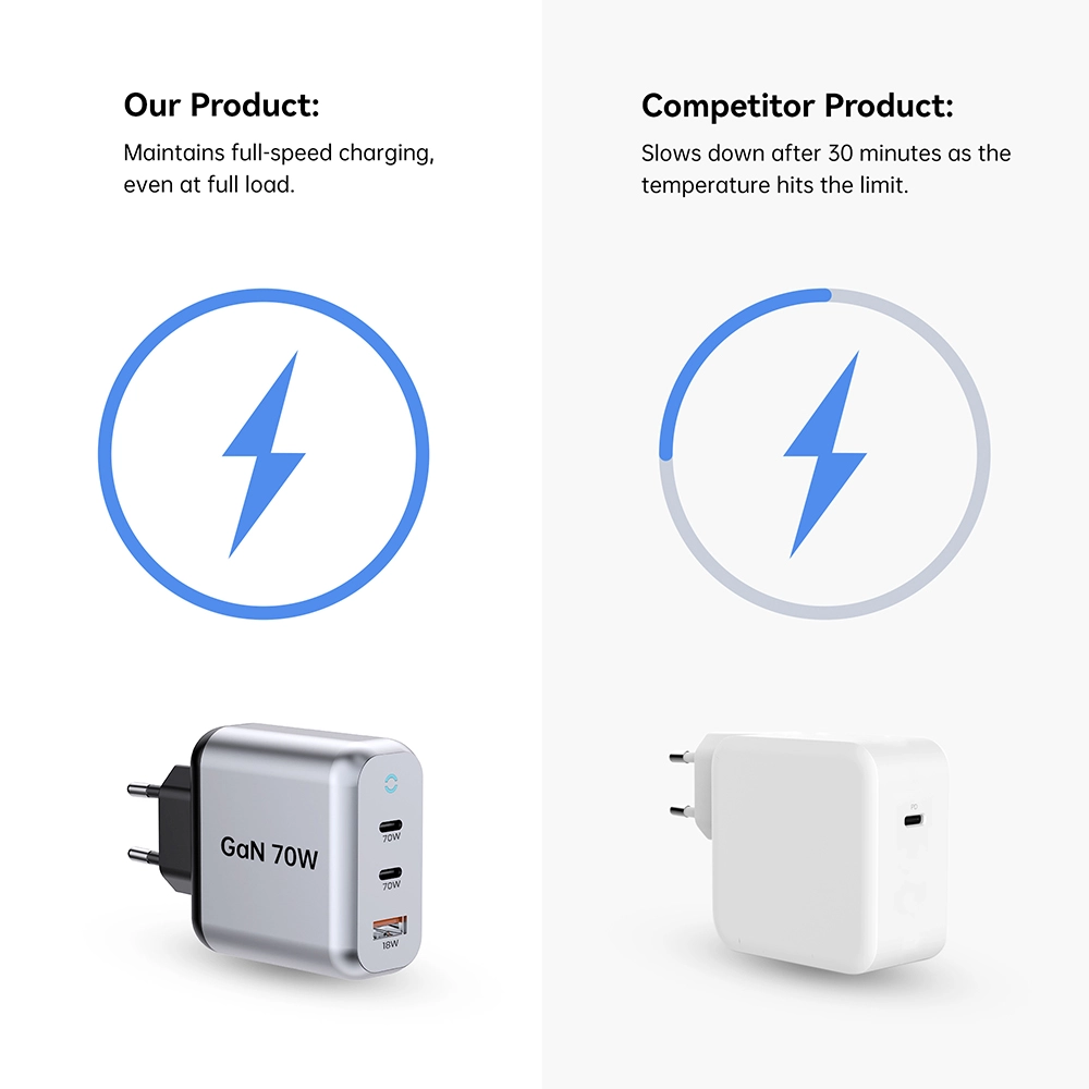 Chargeur rapide Starwell durable 70 W PD pour tablette latpop, également appelé 70 W GaN Fast Charger : 2C1A, répondant au besoin quotidien de charge rapide des téléphones mobiles et des tablettes. De petite taille, performante, avec une technologie avancée de nitrure de gallium. Lorsqu'elle est utilisée dans un seul port, la puissance de sortie maximale de l'interface USB-C1 est de 70 W. Lorsque les deux ports sont utilisés ensemble, l'USB-C1 maintient toujours une charge rapide PD de 45 W. Prend en charge plusieurs protocoles de charge rapide, notamment PD3.0, PPS, QC4+ et QC3.0, assurant une large compatibilité avec divers appareils.