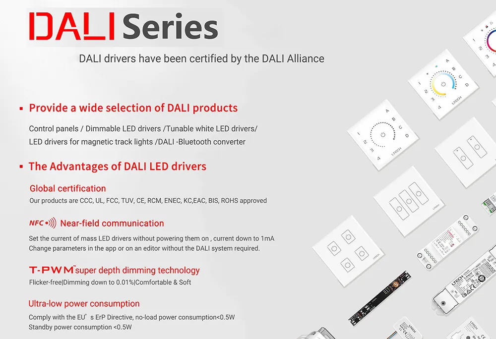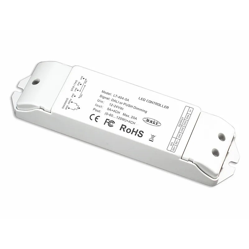Contrôle de gradation DALI avancé – Permet une gradation numérique de 0,1 % à 100 % avec une haute résolution, prenant en charge jusqu'à 64 adresses DALI pour un contrôle individuel ou de groupe dans les systèmes d'éclairage automatisés.