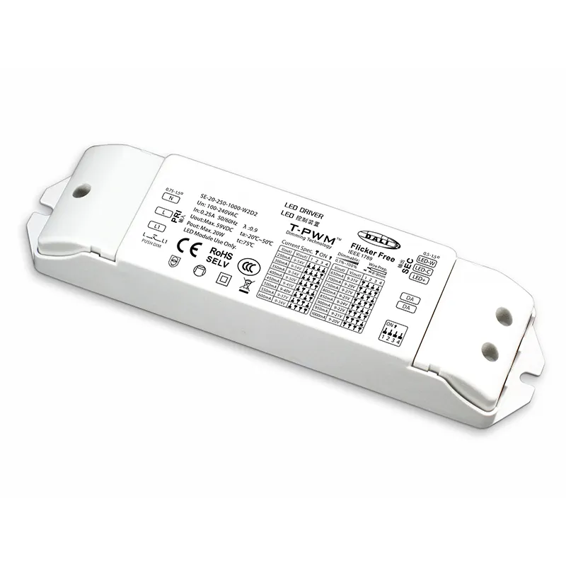 Ce driver LED DALI dispose d'une tension de sortie constante de 12 V ±2 %, fournissant un éclairage constant sans scintillement. Il accepte une plage de tension d'entrée universelle de 100 à 240 V CA, ce qui le rend adapté à une utilisation mondiale. L'appareil fonctionne avec un rendement élevé allant jusqu'à 90 %, réduisant ainsi le gaspillage d'énergie et la génération de chaleur. Il comprend une protection complète contre les courts-circuits, les surcharges, les surtensions et les surchauffes. Doté d'un boîtier métallique durable et d'un indice IP65, il est protégé contre la poussière et les jets d'eau, garantissant des performances fiables dans les environnements intérieurs et extérieurs (plage de température de fonctionnement : -20°C à +50°C). L'interface DALI prend en charge la gradation de 0,1 % à 100 % sans bruit audible, permettant un réglage fluide et flexible de la lumière.