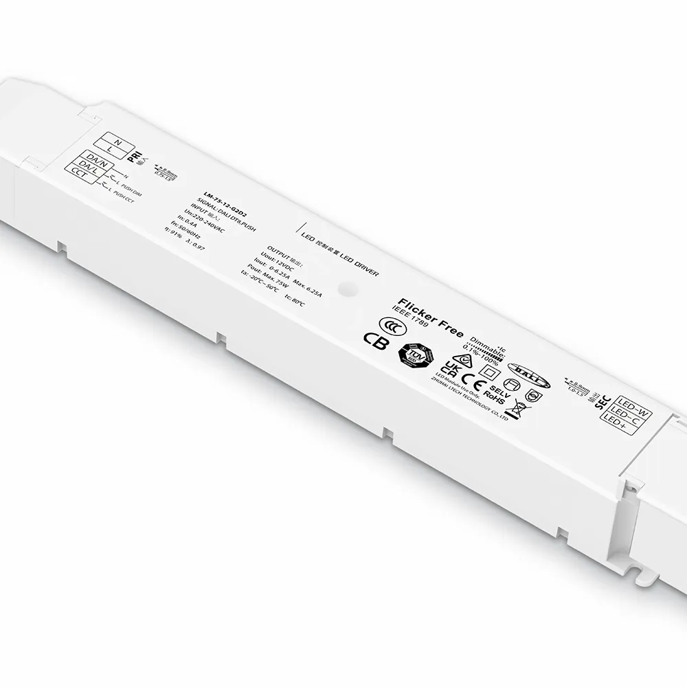 Le driver LED DALI à intensité variable 75 W 12 V à tension constante de haute qualité STARWELL est une alimentation haute performance conçue pour les systèmes d'éclairage LED professionnels. Il fournit une sortie stable de 12 V CC avec une puissance maximale de 75 W, garantissant un fonctionnement fiable pour une large gamme d'applications LED basse tension, notamment les bandes lumineuses, la signalisation et l'éclairage décoratif. Grâce à la compatibilité de gradation DALI intégrée, le driver LED permet un contrôle numérique précis et une intégration transparente dans les réseaux d'éclairage intelligents.