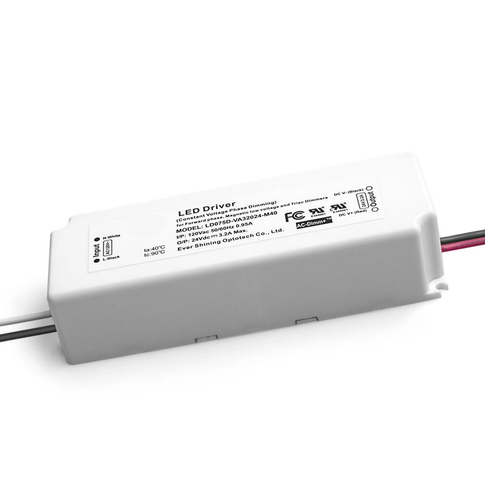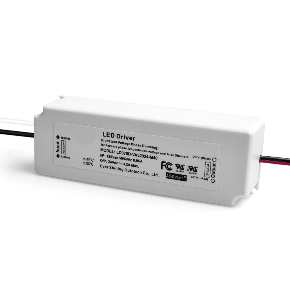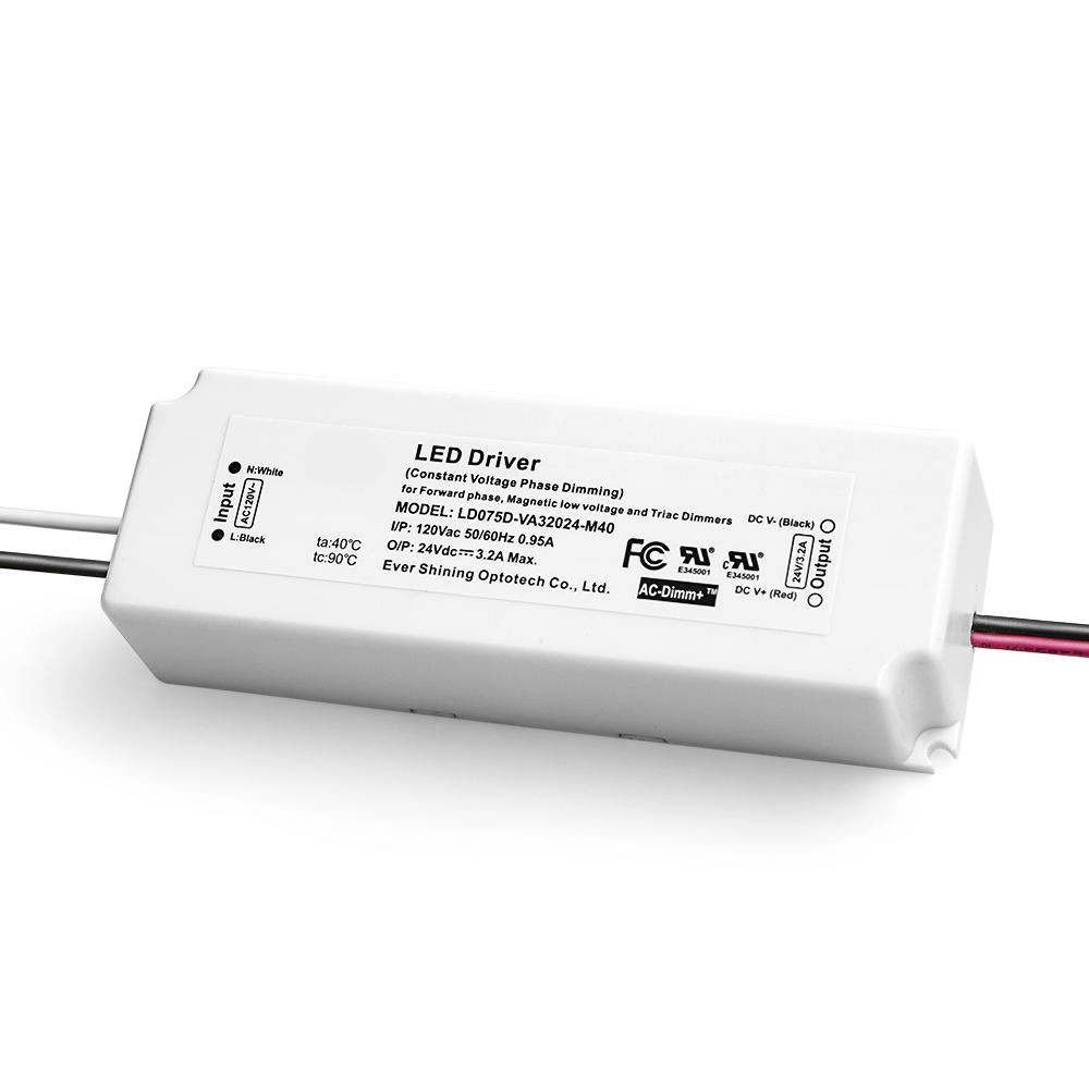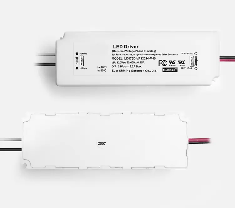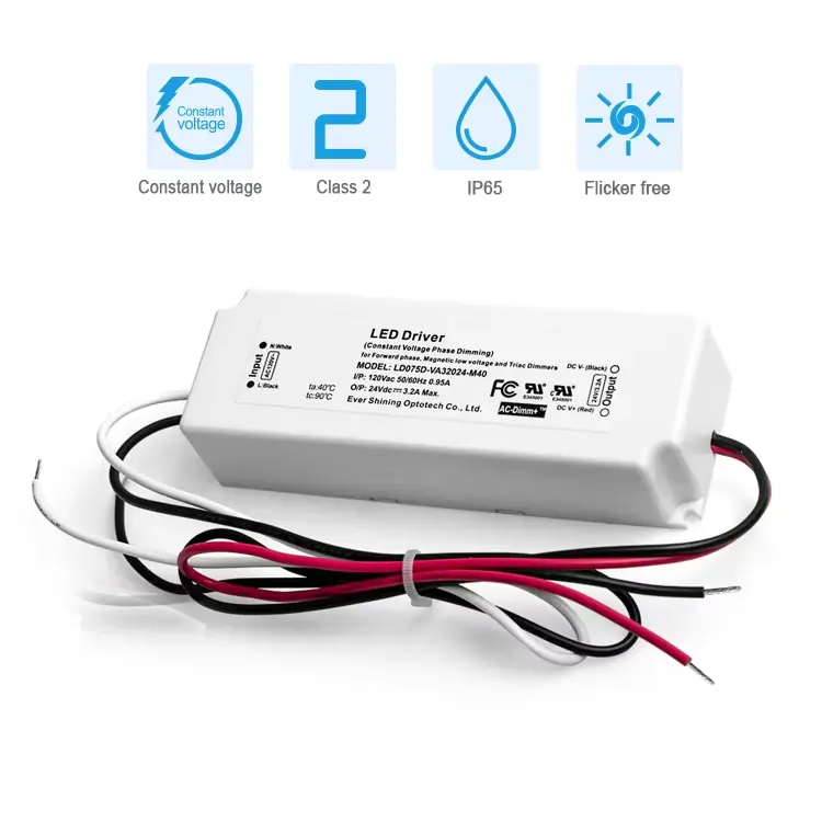 Driver LED à tension constante de 75 W avec gradation TRIAC • Compatibilité : fonctionne avec la plupart des gradateurs TRIAC/à incandescence standard. • Sortie stable : tension constante (CV) pour les systèmes LED 12 V ou 24 V. • Contrôle fluide : permet une gradation complète et sans scintillement. • Protection robuste : protections intégrées contre les défauts électriques. • Utilisation typique : parfait pour les bandes, modules et éclairages sur rail LED à intensité variable.