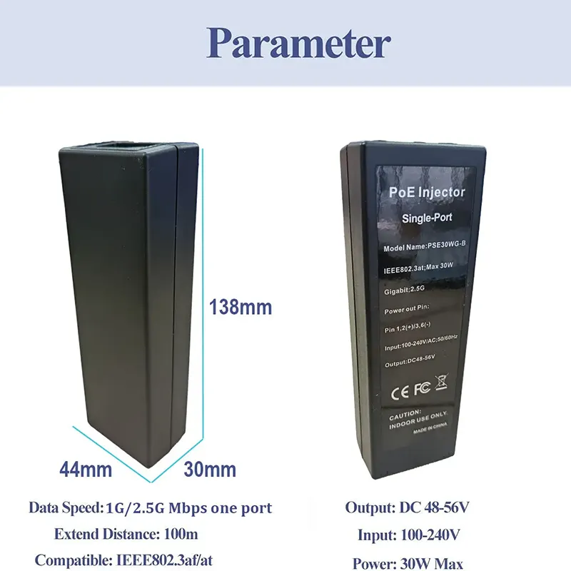 1. Injecteur POE gigabit 60 W : 1 pièce 2. Guide de l'utilisateur : 1 pièces 3. Certificat. Carte de garantie: 1 pièces |