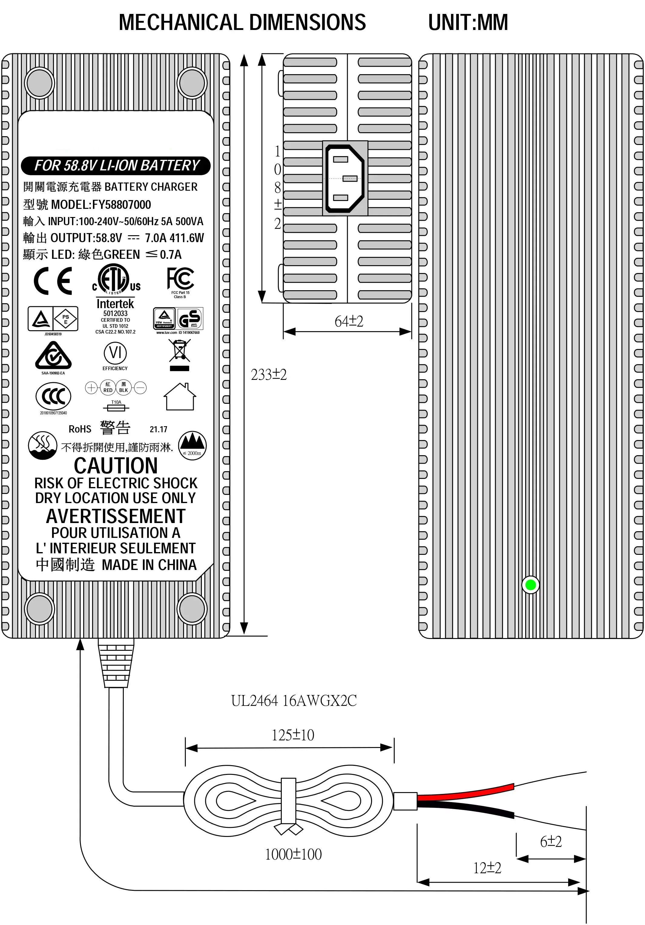 Certifié selon les normes UL, ETL, CUL, GS, CE, BS, SAA, KC, PSE, CB, FCC, EMC, RoHS, REACH, ce chargeur fournit une alimentation efficace, rapide et sûre pour les applications exigeantes de mobilité électrique.