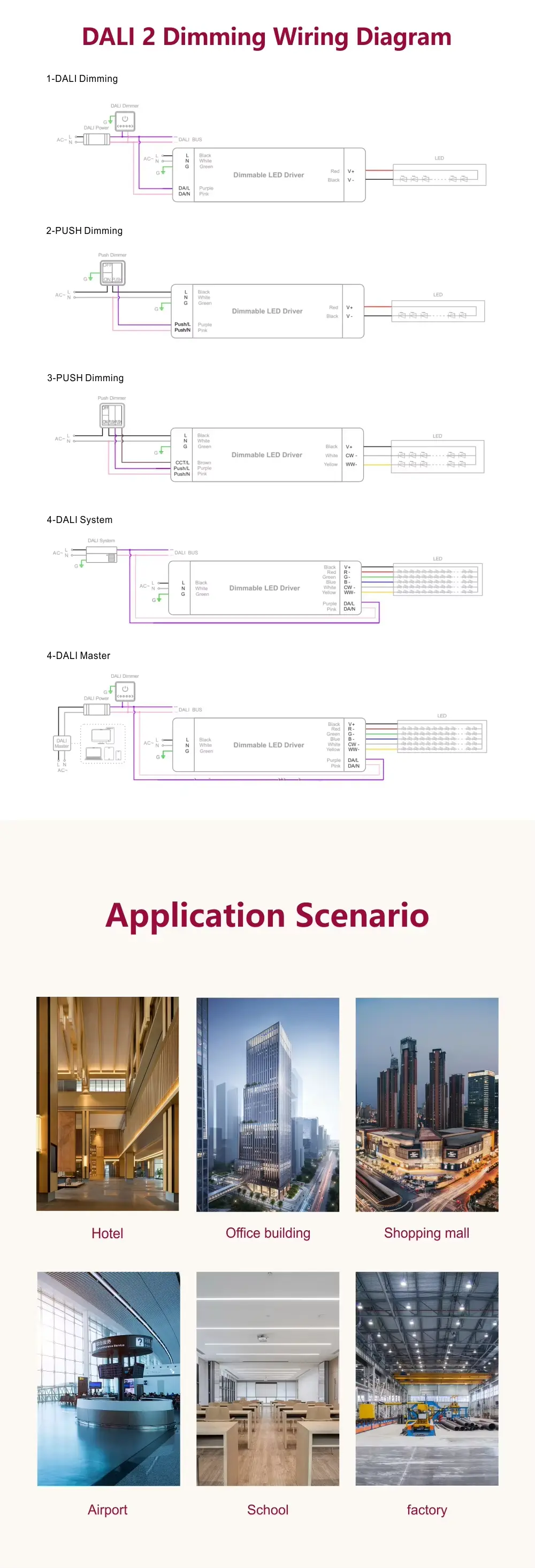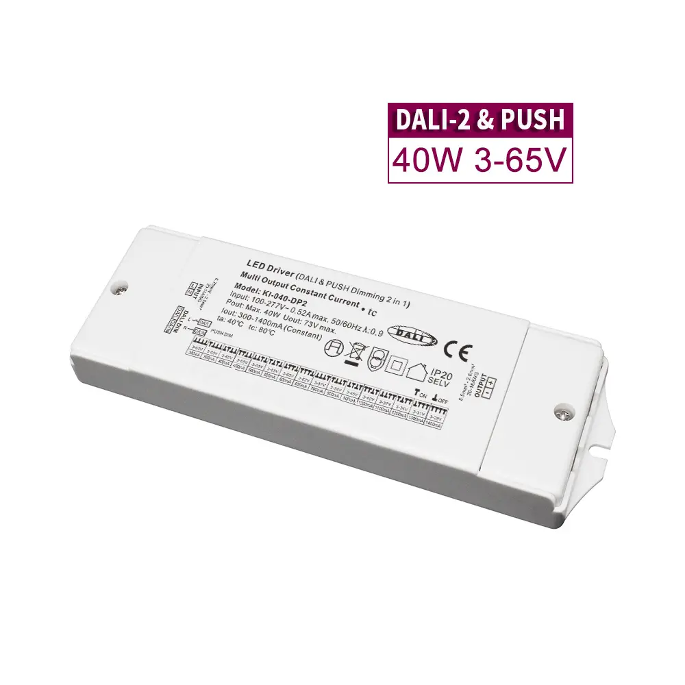 Le driver LED à gradation CCT à courant constant DALI convient aux projets architecturaux, commerciaux et hôteliers haut de gamme. Il permet un réglage précis de la température et de l'intensité de la couleur de la lumière à partir d'un seul driver. Le DALI-2 DT8 garantit un contrôle évolutif et interopérable pour les scènes sophistiquées et la gestion de l'énergie, tandis que l'option manuelle Push Dimming simplifie les configurations où un système de contrôle dédié n'est pas requis.