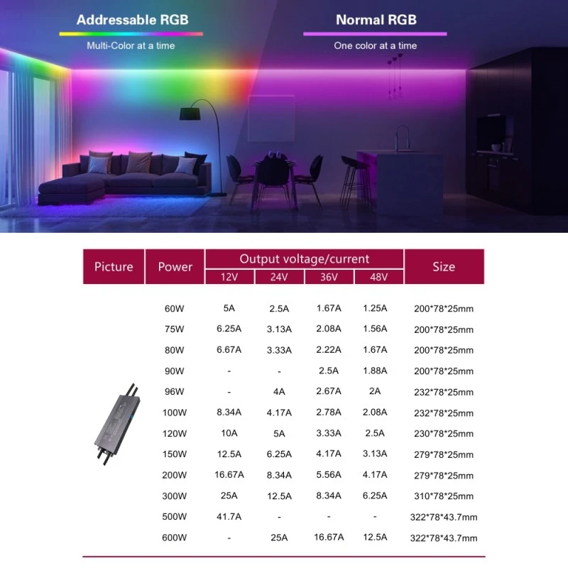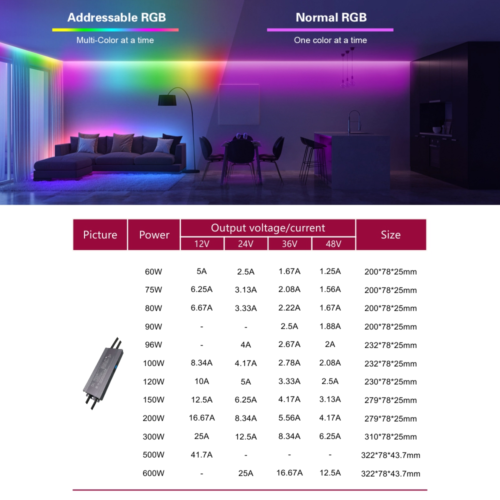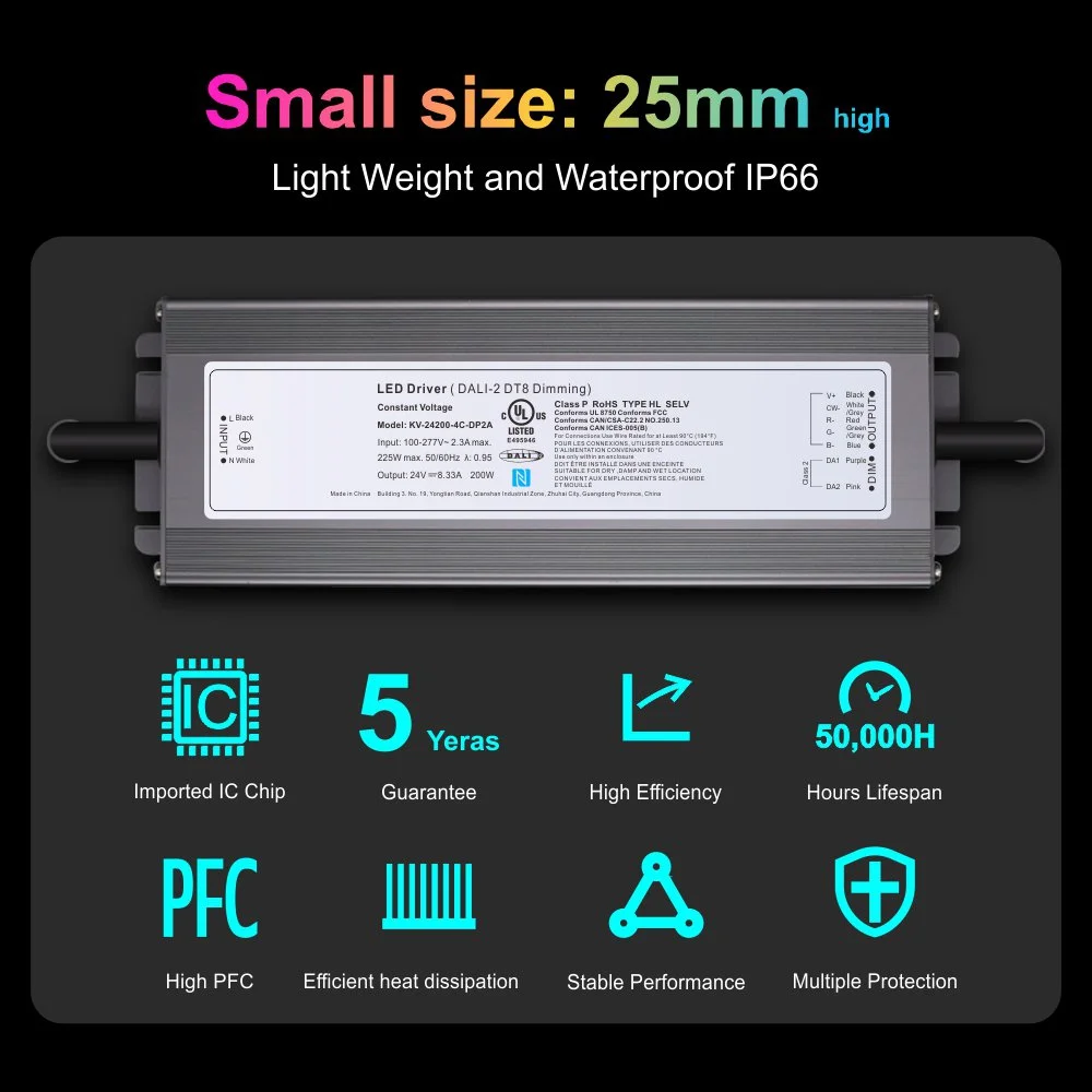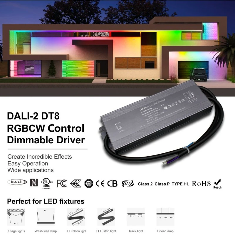 Sa conception de base vise à répondre aux exigences d'installation et d'application les plus exigeantes. L'alimentation adopte un mode de sortie à tension constante, fournissant une tension CC stable de 12 V ou 24 V, et est optimisée pour piloter diverses bandes lumineuses et modules LED. Ce qui est impressionnant, c'est que tout en délivrant une puissante force motrice de 200 W, il atteint une taille ultra-compacte, économisant considérablement de l'espace d'installation dans les boîtes de jonction ou les plafonds étroits. La série de produits est flexible, offrant différentes versions de canaux de 1 à 5 canaux : la version monocanal est destinée à une gradation pure, la version double canal contrôle indépendamment la lumière blanche froide et chaude pour obtenir un réglage CCT complet, et la version cinq canaux est un puissant driver de LED RVB CCT à tension constante DALI de 200 W à intensité variable, capable de contrôler simultanément la couleur RVB et la lumière blanche froide et chaude, générant des milliards de couleurs et d'atmosphères.