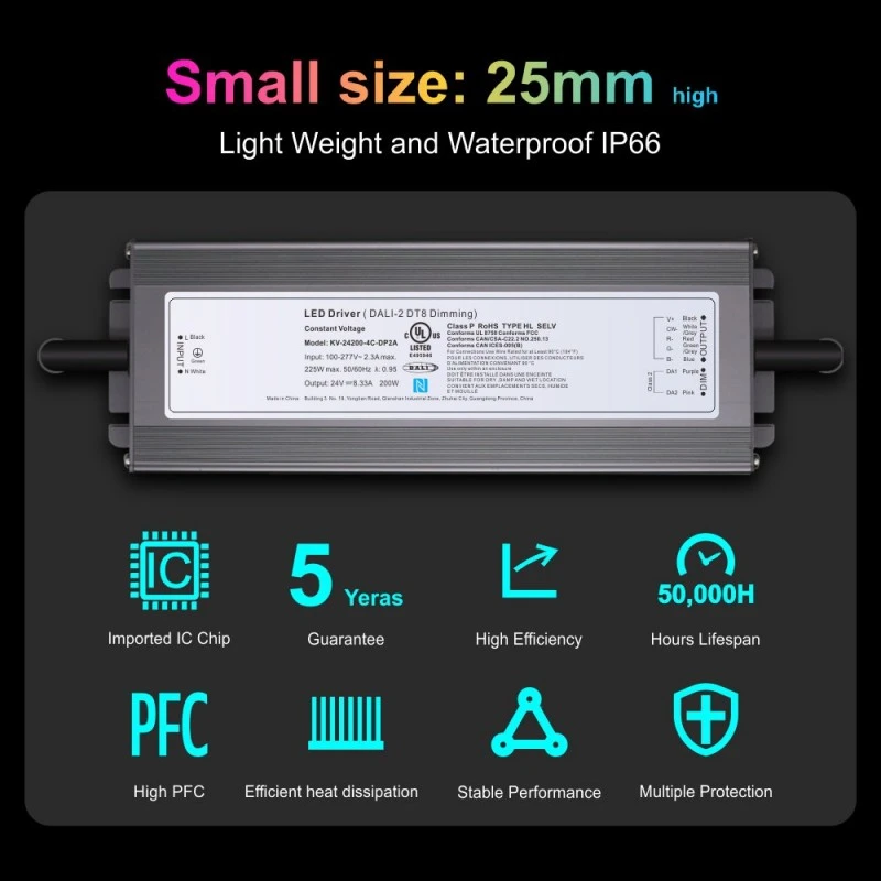 La qualité et la tranquillité d'esprit que nous promettons se reflètent dans chaque détail. Le produit a obtenu la certification UL, répondant aux normes de sécurité internationales strictes, et est accompagné d'une garantie de 5 ans pour l'assurance qualité. En un mot, il ne s’agit pas seulement d’une alimentation électrique ; c'est un cœur de contrôle d'éclairage puissant, fiable et flexible. En choisissant ce véritable Driver LED DALI 2 DT8 Dimmable 200W, vous optez pour une solution d'éclairage intelligente de qualité professionnelle et tournée vers l'avenir.