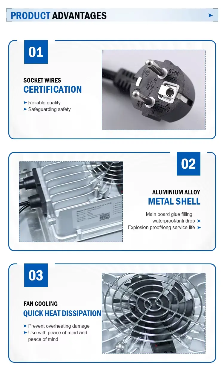 Haute efficacité et protection intelligente : Atteignant jusqu'à 93 % d'efficacité et un facteur de puissance ≥0,98, ce chargeur minimise les pertes d'énergie et réduit les coûts d'exploitation. Les protections intégrées incluent des protections contre les surtensions, les courts-circuits, l'inversion de polarité et la surchauffe. Un indicateur LED indique clairement l'état de charge en un coup d'œil.