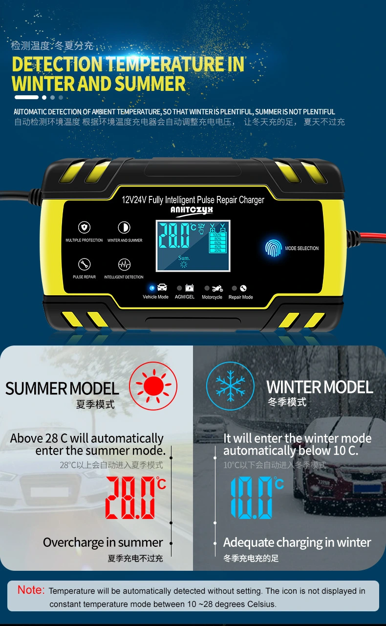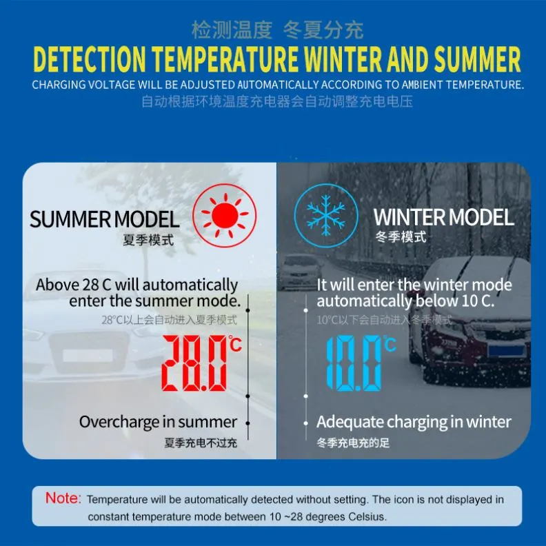 · Mode d'entretien automatique : fonctionne comme un chargeur d'entretien et un entretien de batterie à long terme, idéal pour les véhicules saisonniers ou rarement utilisés.