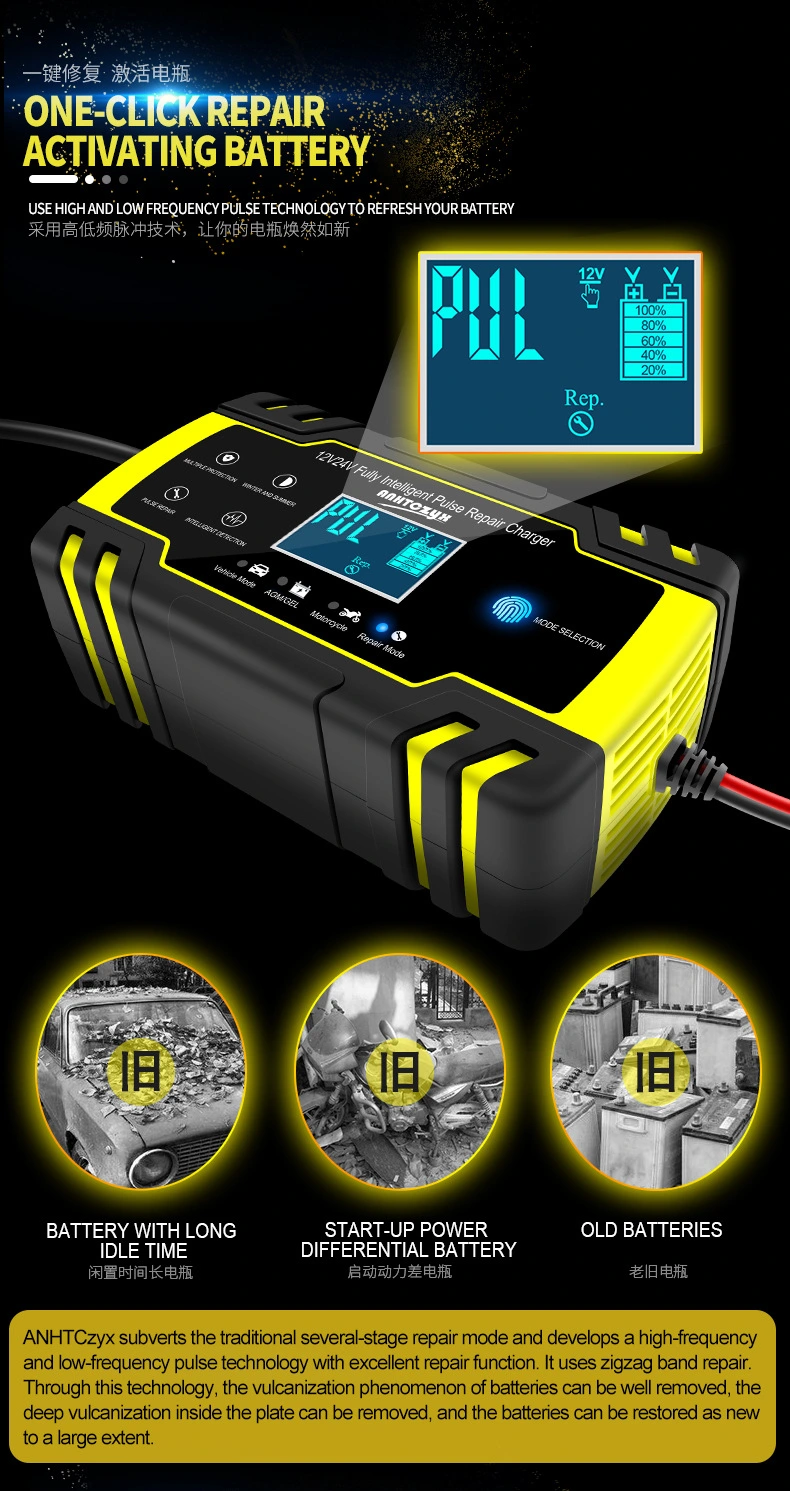 · Fonction de réparation d'impulsions : utilise la technologie d'impulsions à haute fréquence pour réduire la cristallisation du sulfate de plomb (sulfatation), aidant ainsi à restaurer la capacité perdue des batteries vieillies ou sous-chargées.